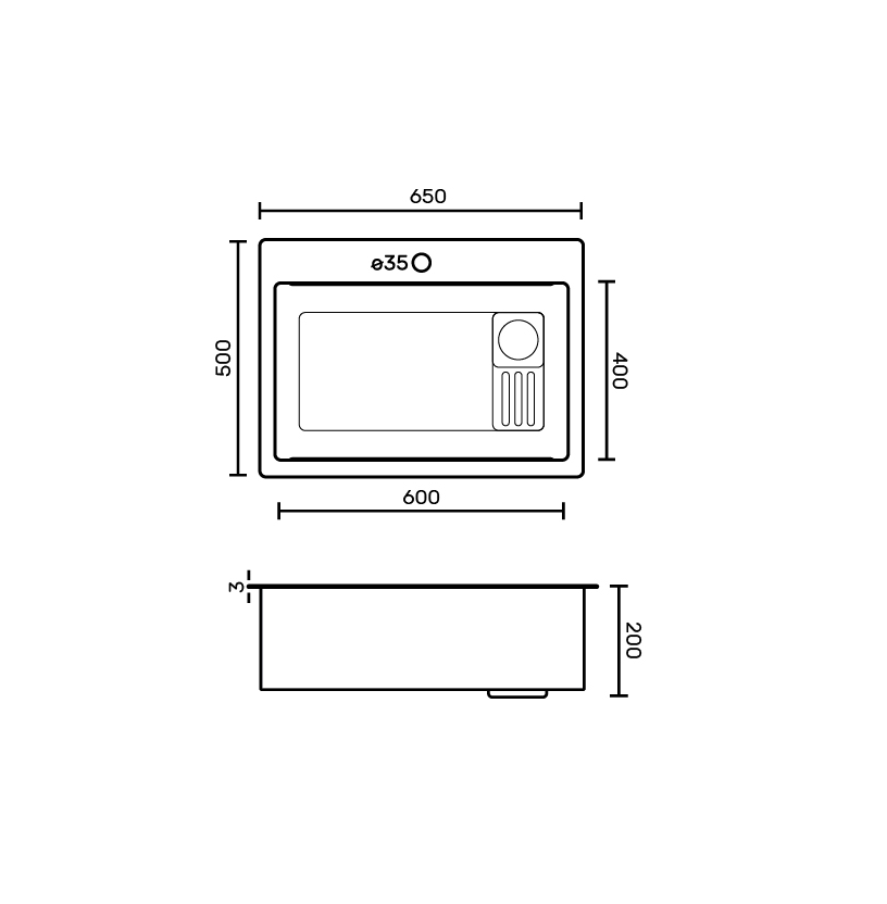 Купить Мойка врезная 65х50 см, толщина 3,0х0,8 мм, глубина 200 мм + большой сифон с переливом + корзина