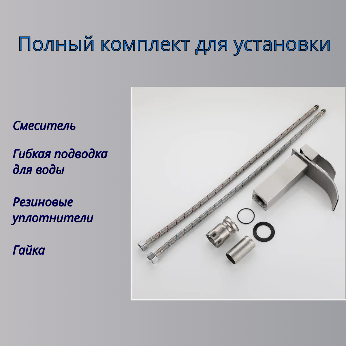 | Комплектация | Смеситель - 1шт., Шланг подачи воды (гибкая подводка) - 2шт., монтажные аксессуары |