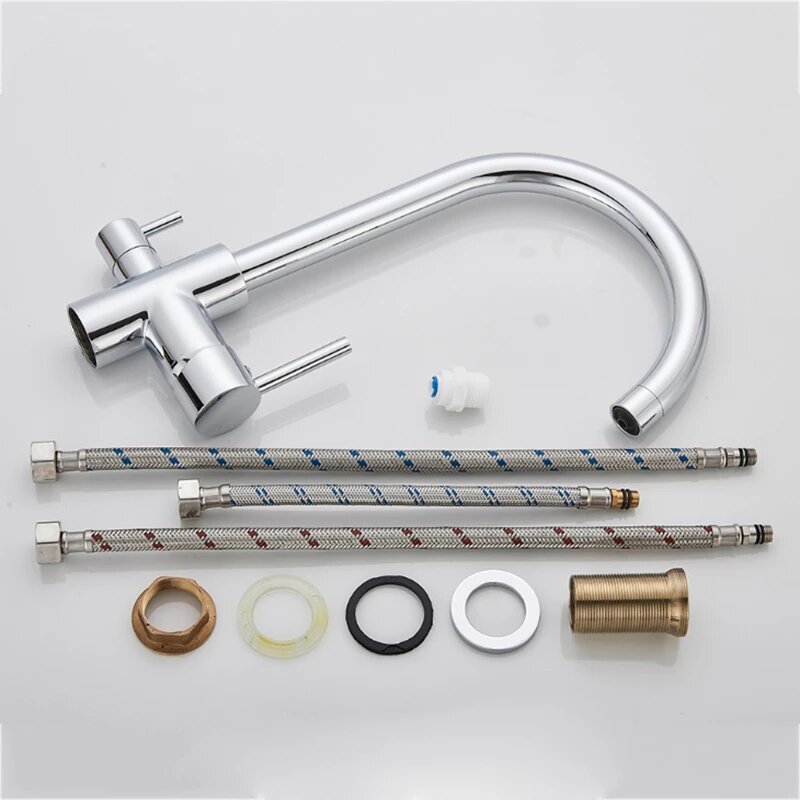 | Комплектация | смеситель, прокладка, монтажная гильза с резьбой, фиксирующая гайка, 3 шланга, под холодную, горячую и питьевую воду |