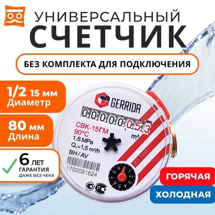 Счетчик воды Универсальный Геррида СВК-15Г, длинна 80 мм с монтажным комплектом / Gerrida, Поверка Не старше 35 дней интересное: