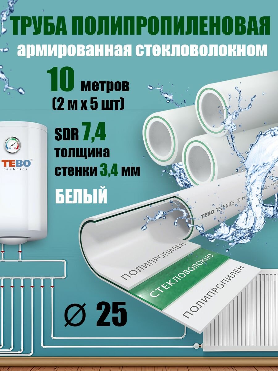 Купить Труба 25 мм полипропиленовая, армированная стекловолокном (для отопления), SDR 7,4, 10 метров (2 м х 5 шт) / Tebo (белый)