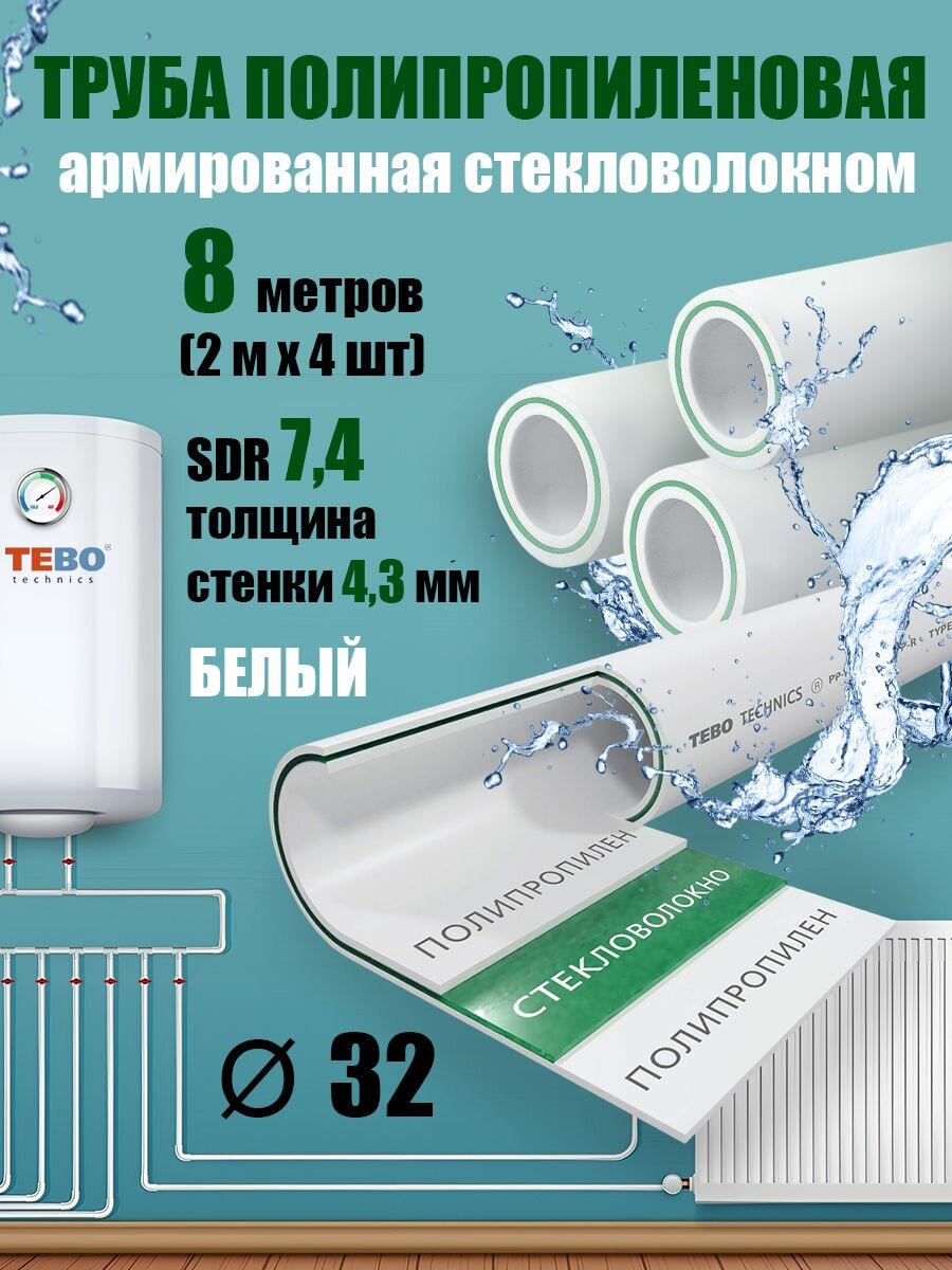 Купить Труба 32 мм полипропиленовая, армированная стекловолокном (для отопления), SDR 7,4, 8 метров (2 м х 4 шт) / Tebo (белый)