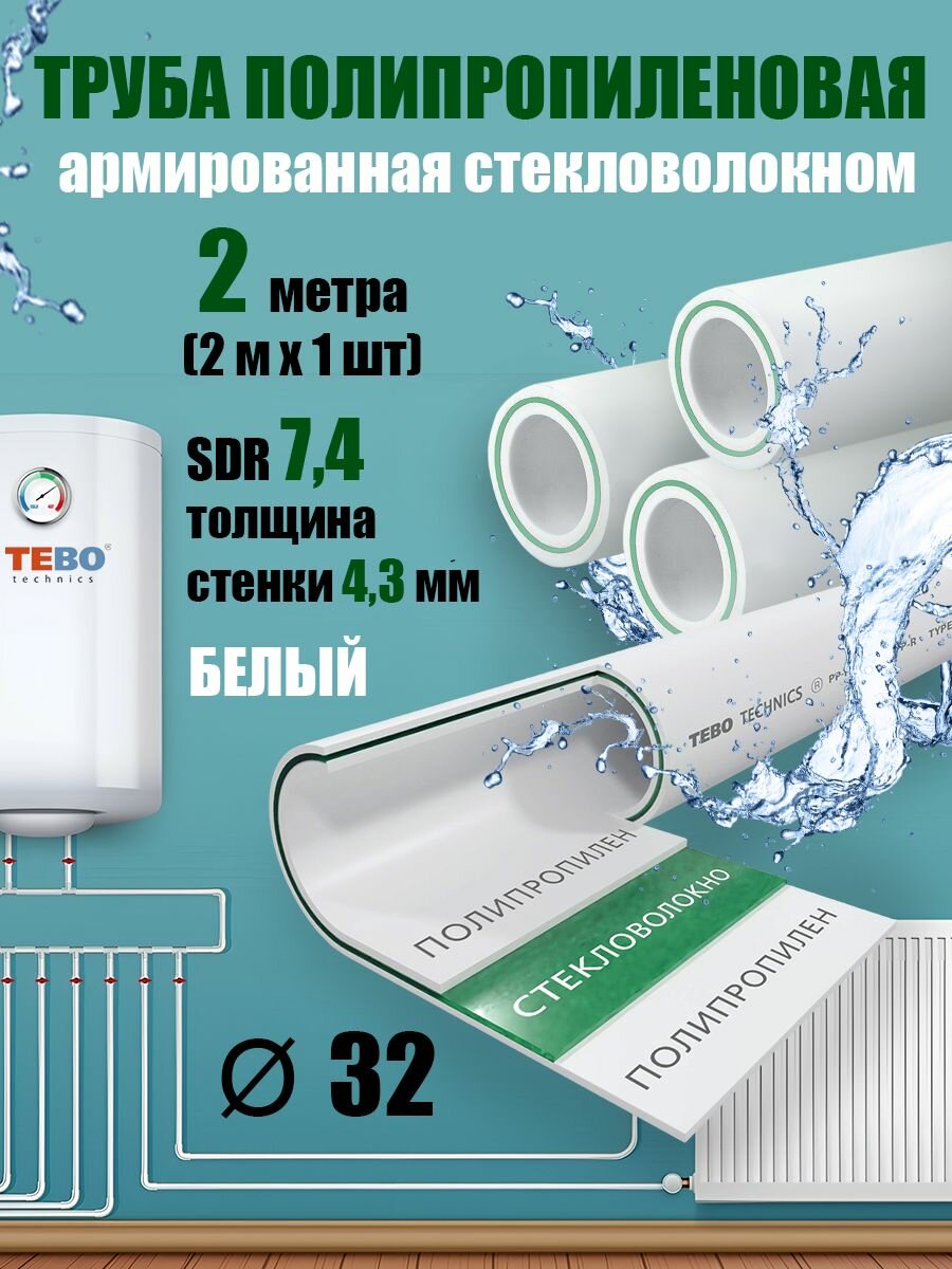 Купить Труба 32 мм полипропиленовая, армированная стекловолокном (для отопления), SDR 7,4, 2 метра (2 м х 1 шт) / Tebo (белый)