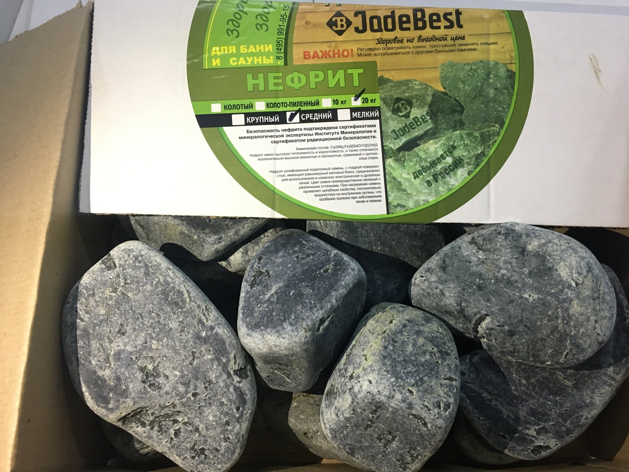 Нефрит шлифованный (тёмно-болотный) ЖадеБест средняя фракция 7-14 см для бани и сауны 10 кг интересное: