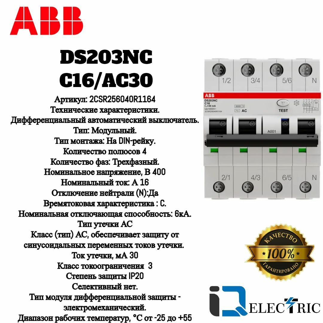 Дифференциальный автомат ABB 4-полюсный DS203NC C16 AC 30мА 6кА 4 модуля