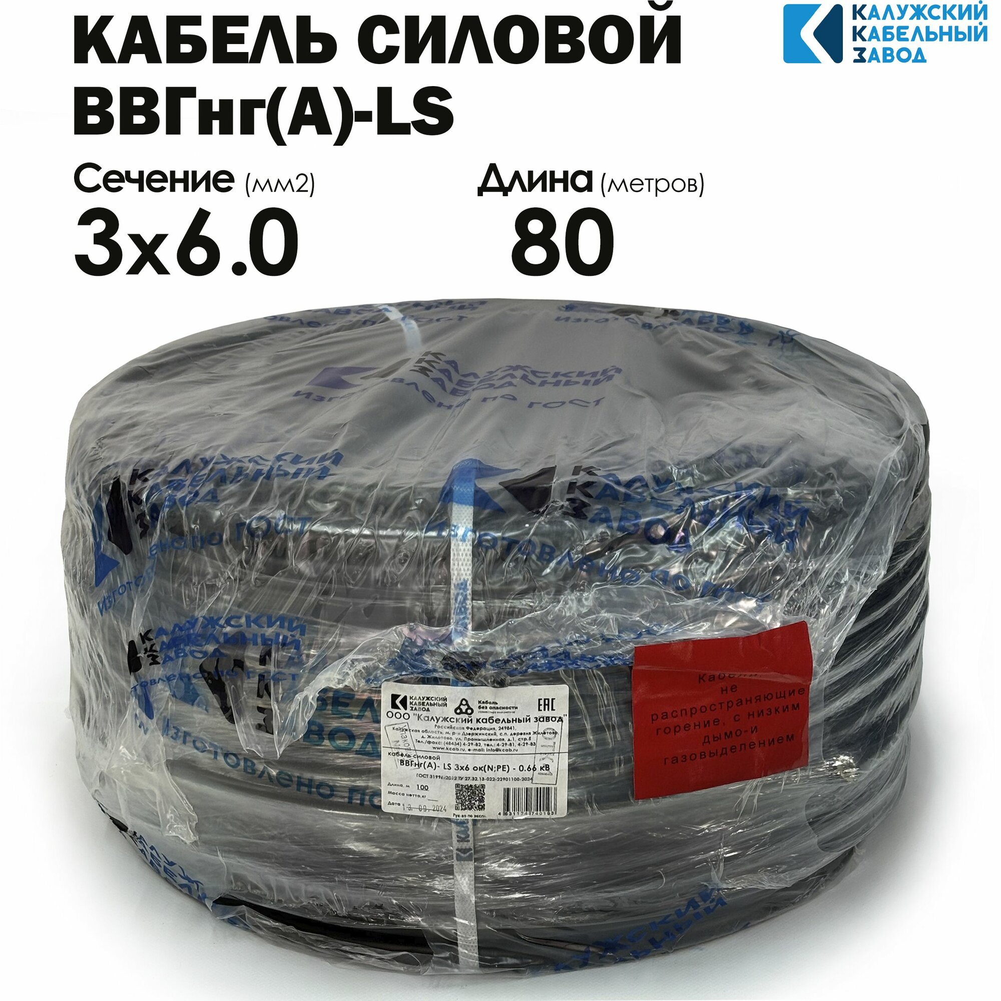 Силовой кабель ВВГнг(А)-LS 3х6 ГОСТ 80метров Калужский кабельный завод