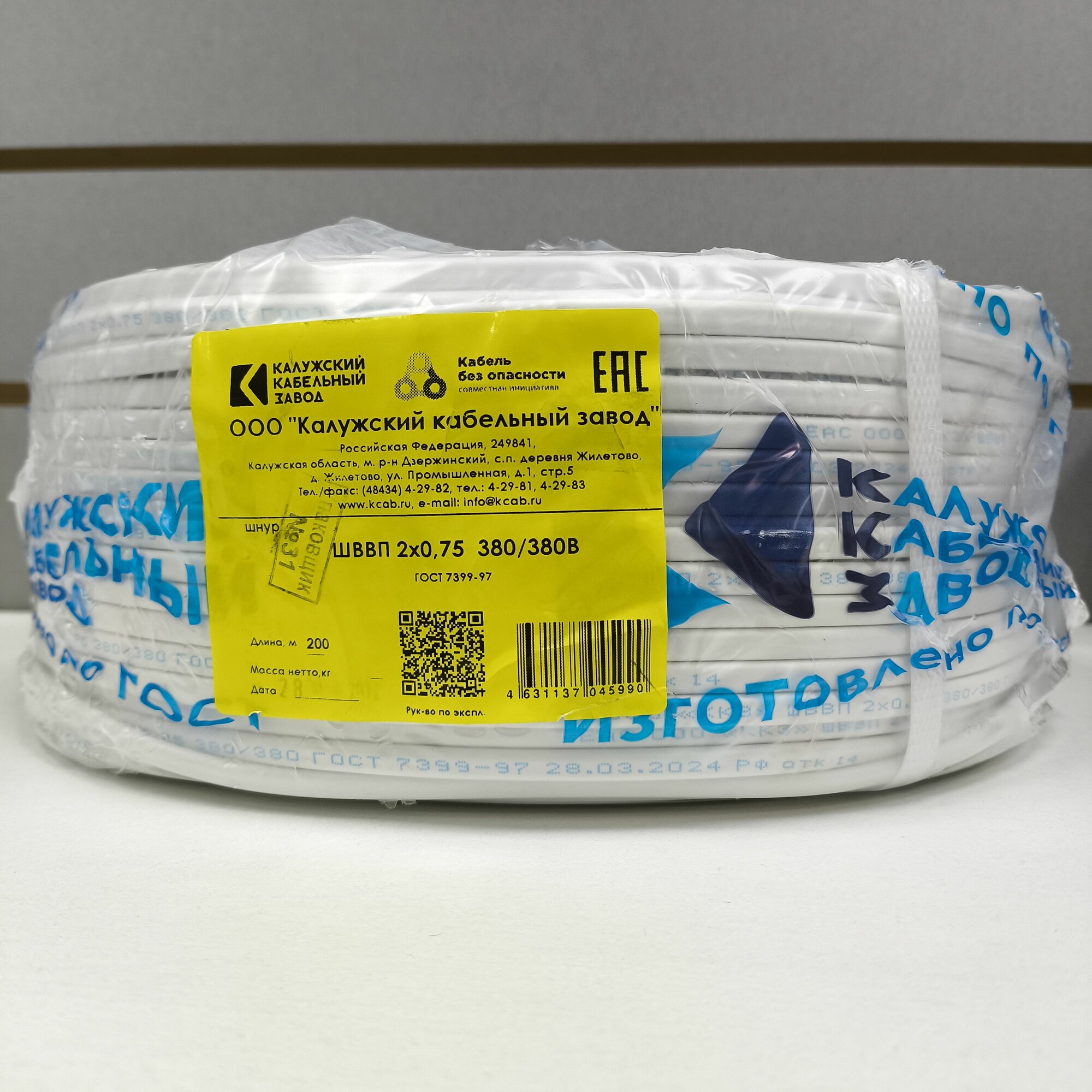 Провод ШВВП 2х0,75 ГОСТ Калужский кабельный завод. Белый. 20 метров