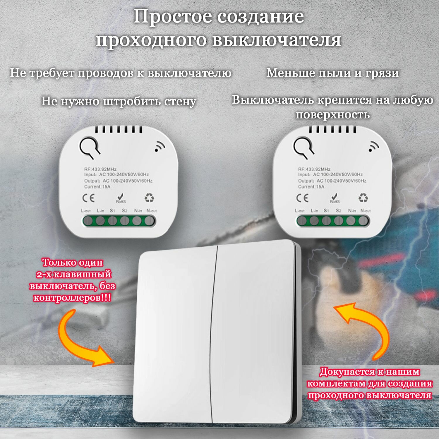 Беспроводной Проходной выключатель Кинетический Белый Комплект 2 Клавиши + Контроллер