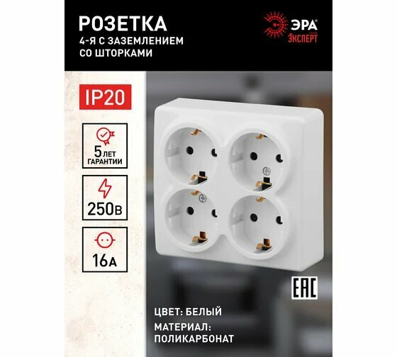 Купить Эра Розетка 4-м ОП Эра Эксперт 11-2211-01 16А IP20 16AX 250В 4х2P+E Schuko защ. шторки бел. Эра Б0020709