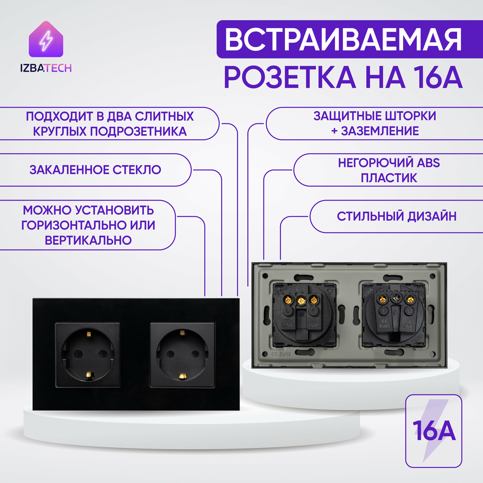 СохранитьДвойная встраиваемая розетка черная на 2 поста 16А в рамке из закаленного стекла с заземлением и защитой от детей интересное: