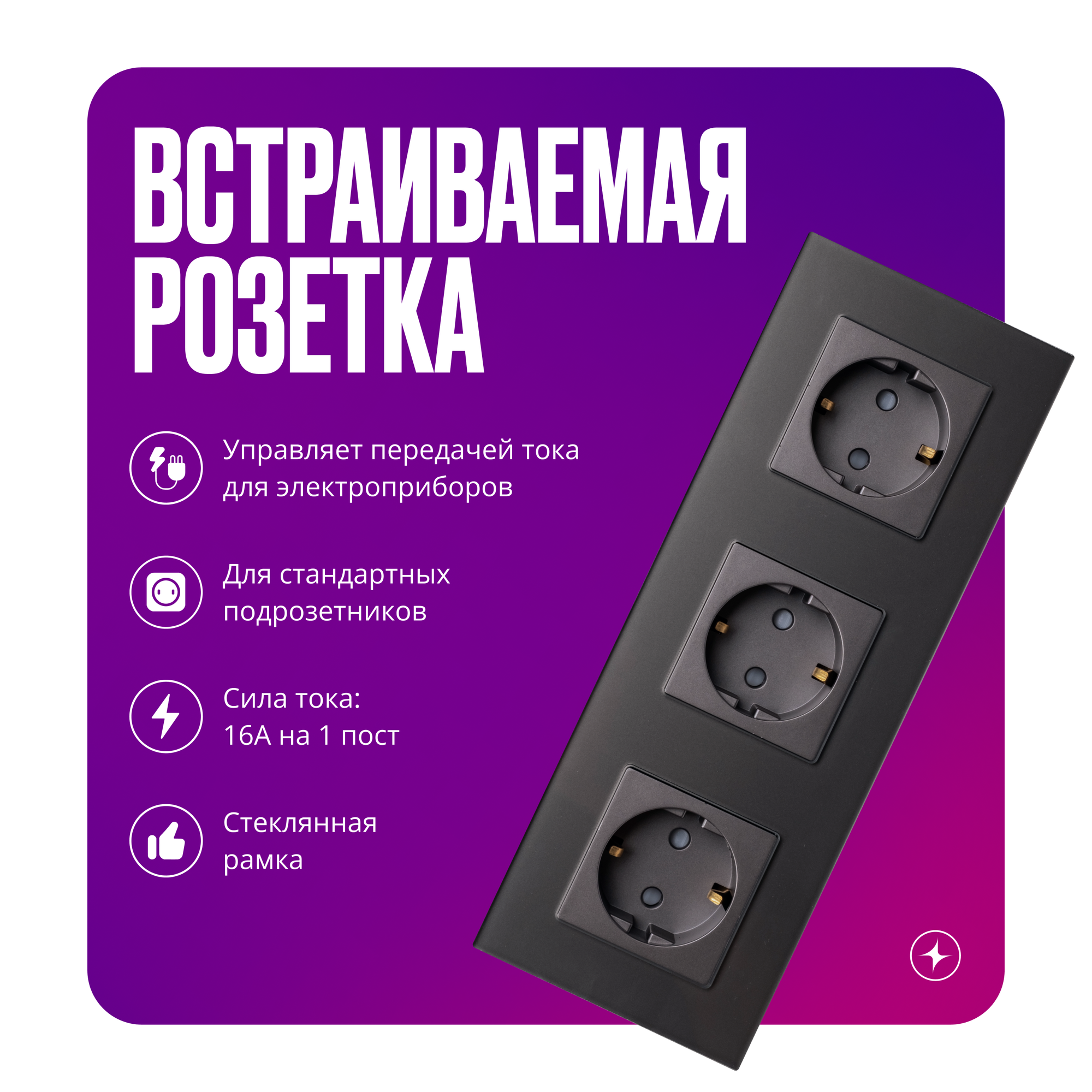 Встраиваемая розетка на 3 поста с заземлением и защитой от детей на 16А тройная стеклянная, черная