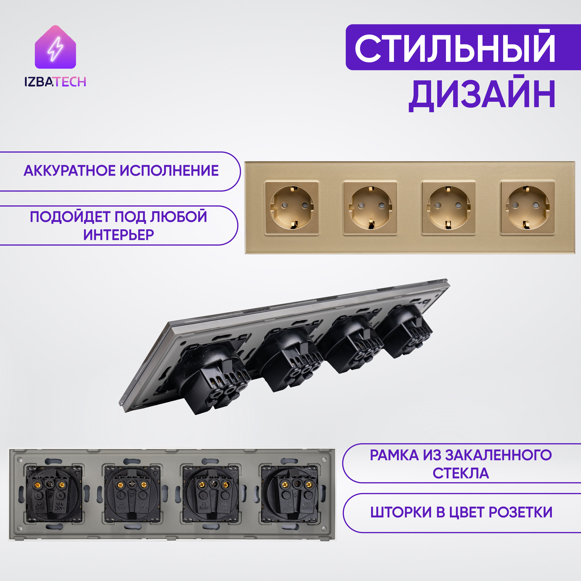 СохранитьВстраиваемая розетка на 4 поста в стеклянной золотой рамке 16А с заземлением и защитой от детей интересное: