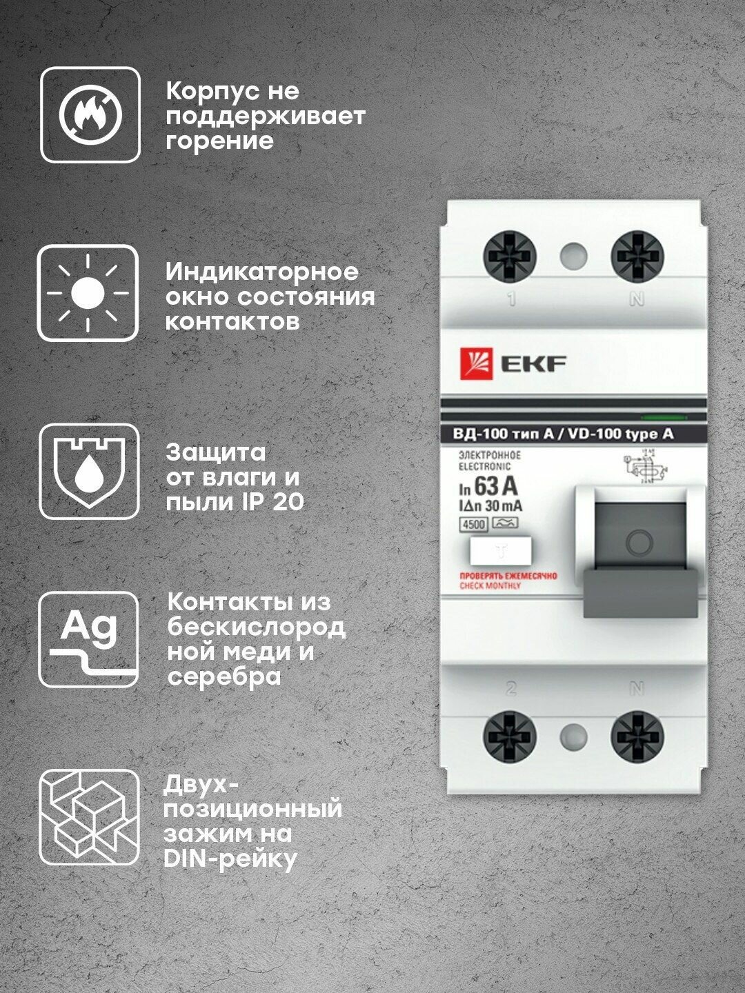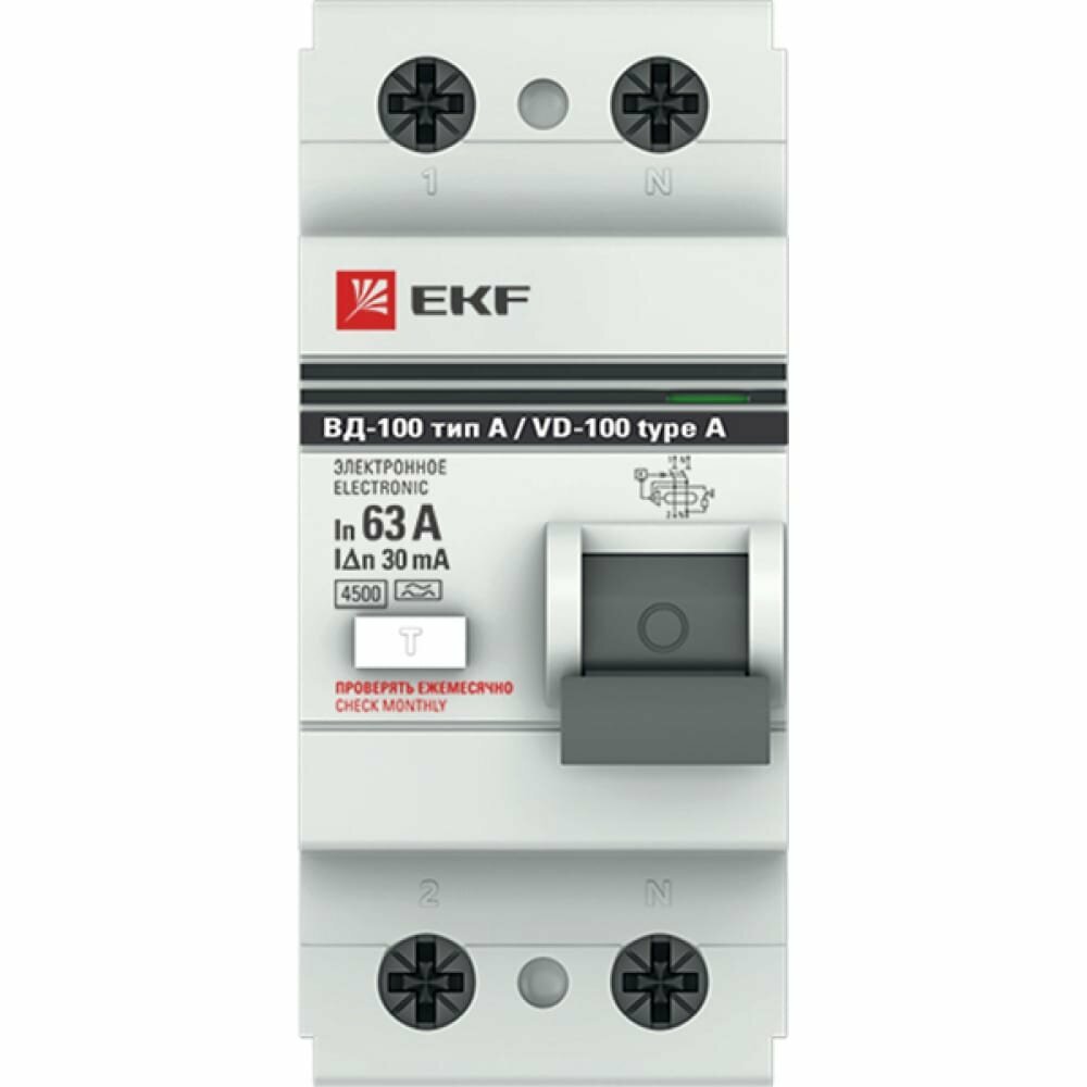 Устройство защитного отключения ВД-100 2P 63А/30мА электронный тип A PROxima, EKF ELCB-2-63-30-E-A-PRO (1 шт.)