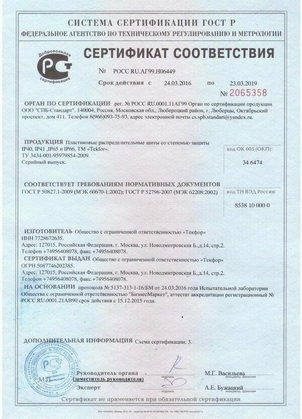 | Дополнительная информация | дверца имеет возможность установки замка; класс электроизоляции II; материал самозатухающий термопластик, обладающий стойкостью к воспламенению при воздействии нагретой до температуры 650°С проволокой (испытание по ГОСТ 27483 (МЭК 60 695-2-1)); рабочие температуры от –25…+60 °С; межосевое расстояние между рядами 150 мм; максимальная высота модульных устройств для установки в щит 53 мм; используемый размер оцинкованной DIN-рейки 35×7,5 мм; щиты изготавливаются согласно стандарта ГОСТ Р 50827 (МЭК 670); цвет корпуса белый RAL 9016 |