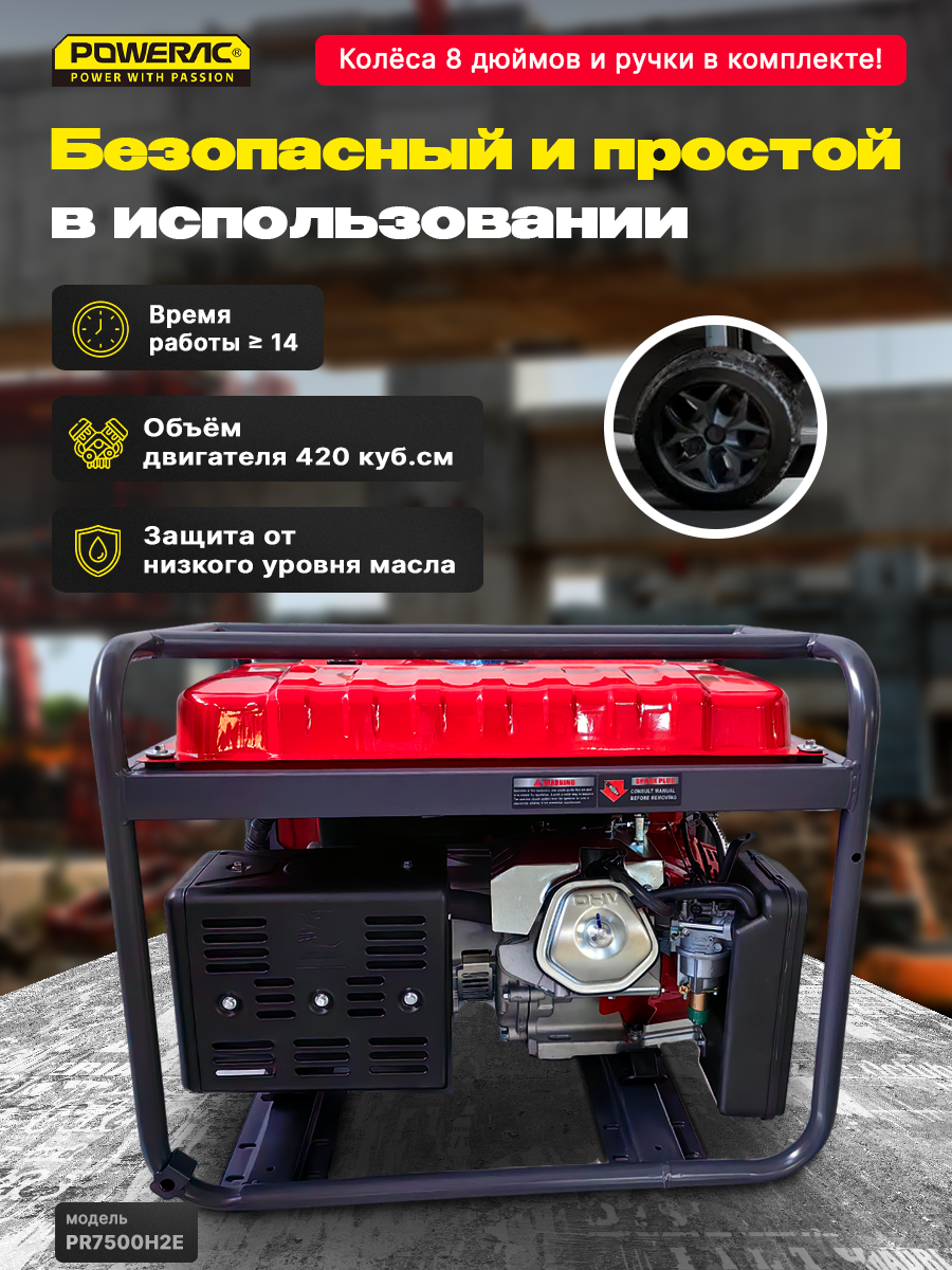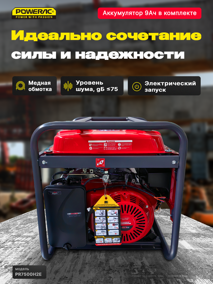 Генератор бензиновый электрический Powerac PR7500H2E (6.5 кВт, 220В, 15л. с, ЭЛЕКТРОСТАРТЕР + АКБ)
