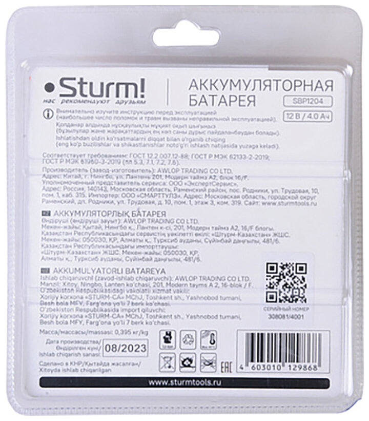 Аккумулятор Sturm SBP1204 12В, 1BatterySystem12V, 4.0 Ач, Li-Ion интересное: