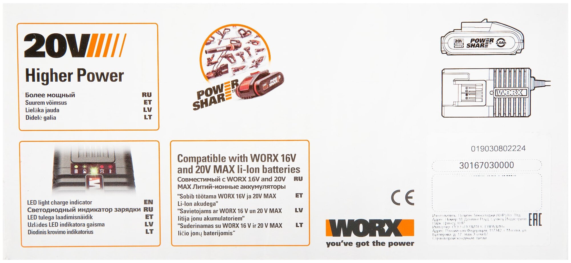 Комплект WORX WA3604: аккумулятор 4 А*ч, 20 В и зарядное устройство 2 А, 20 В, коробка