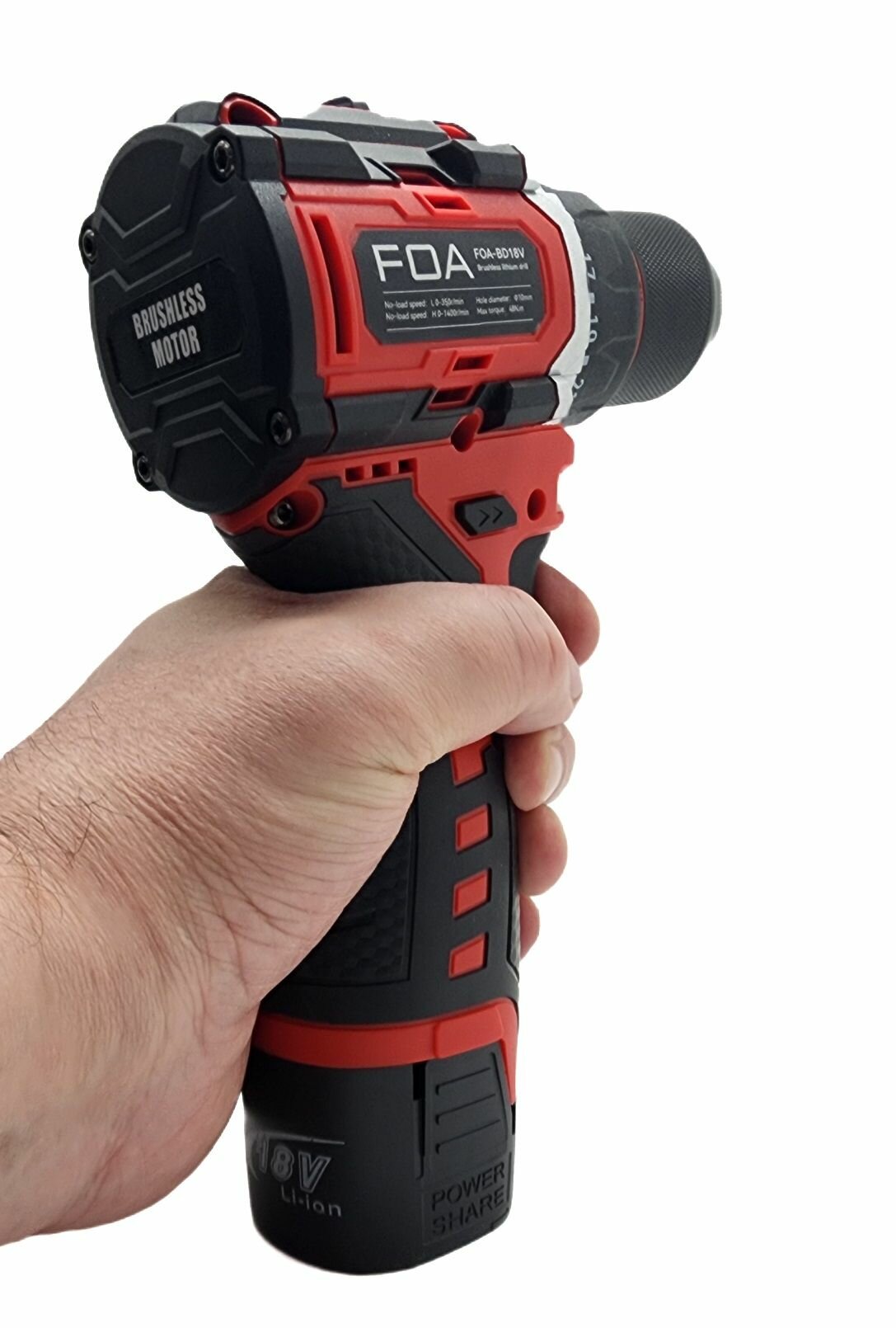 Дрель шуруповёрт с обрезининым покрытием рукоятки и кейсом аккумуляторный FOA-СD21V с бесщеточным двигателем и двумя мощным литиевым аккумуляторами на 21 Вольт