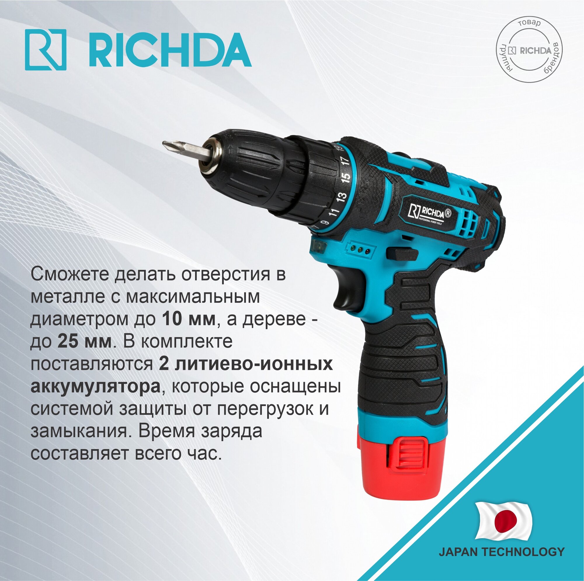 Аккумуляторная дрель-шуруповерт RICHDA DCD212 12В 2.0А.ч интересное: