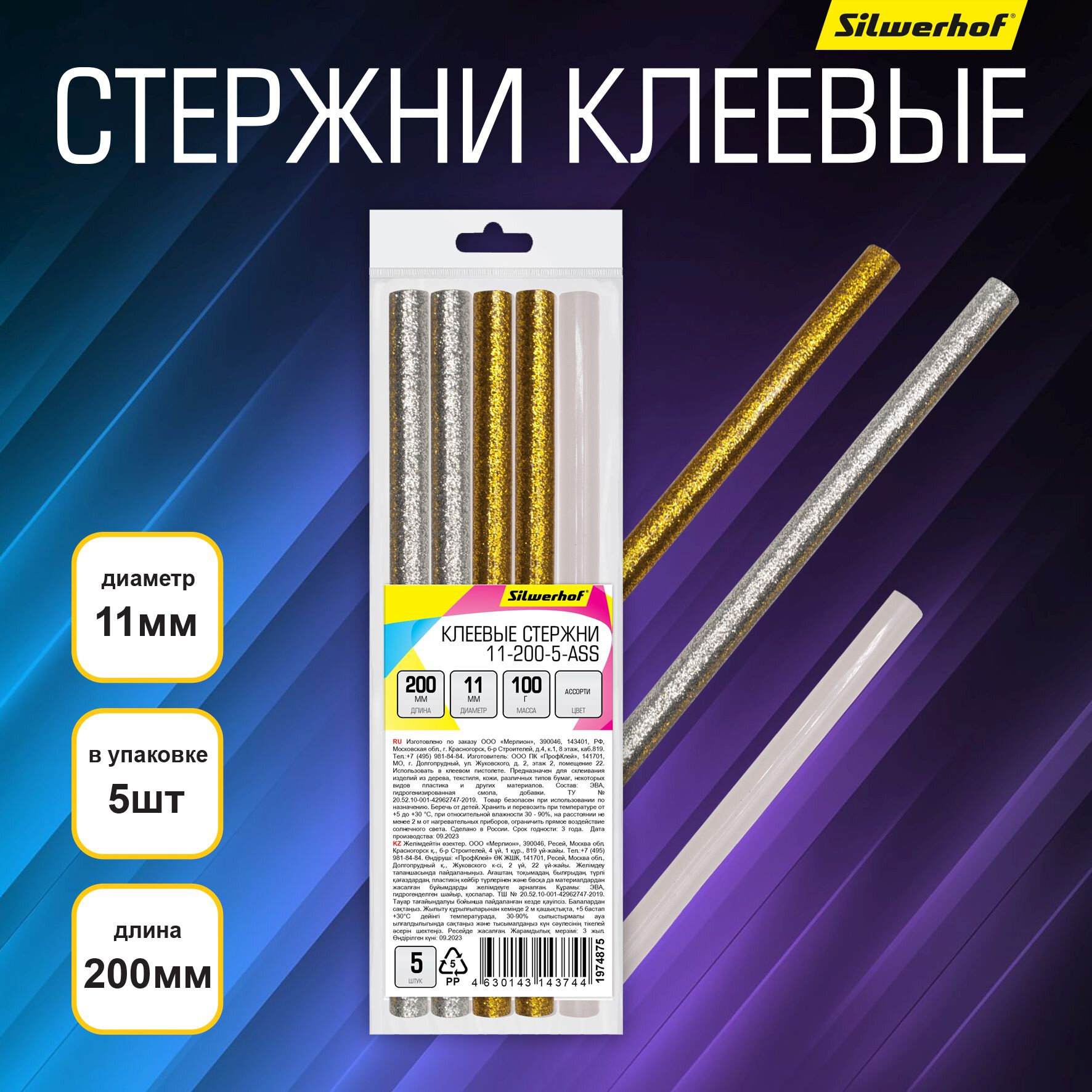 Клеевые стержни Silwerhof Диаметр 11 мм, длина 200 мм, 5 шт (11-200-5-ASS/1974875)