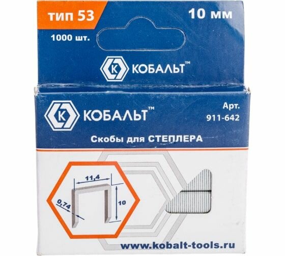 Скобы кобальт для степлера 10 мм, Тип 53, толщина 0,74 мм, ширина 11,4 мм, (1000 шт)