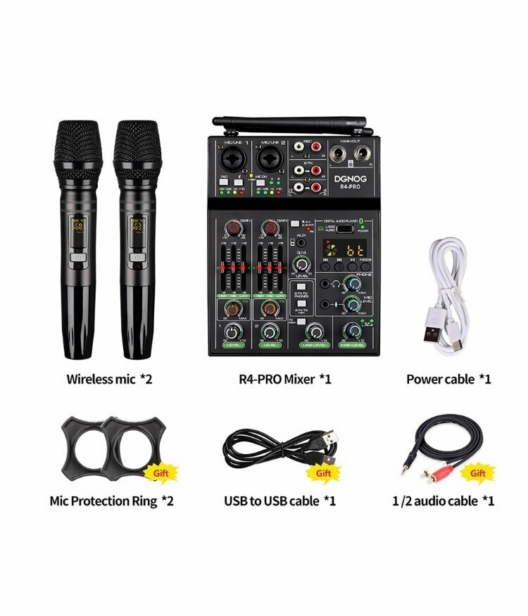 Ниже Вы можете прочитать отзывы на Беспроводной 4-канальный микшер караоке DGNOG R4-PRO bluetooth 2 микрофона black, ознакомится с подробными характеристиками, посмотреть интересные обзоры и фотографии на Беспроводной 4-канальный микшер караоке DGNOG R4-PRO bluetooth 2 микрофона black.