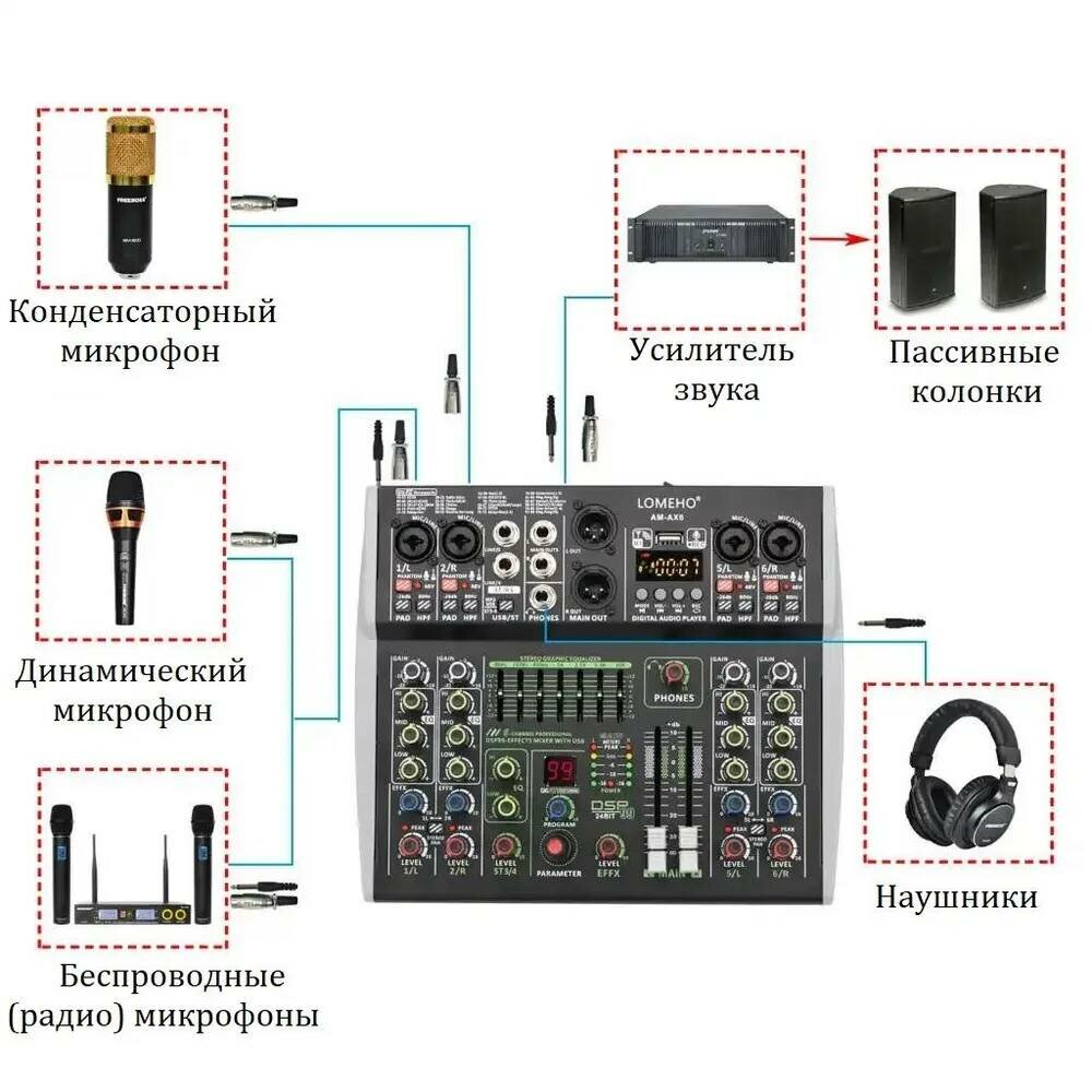 6-канальный Профессиональный микшерный пульт / аудио микшер 99 эффектов DSP с Bluetooth и фантомным питанием (У) интересное: