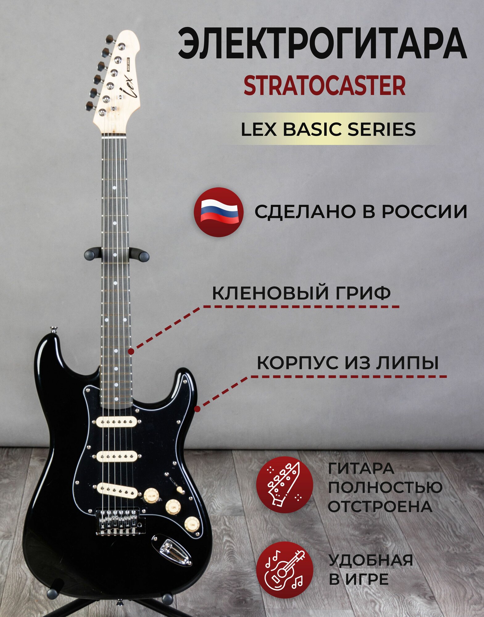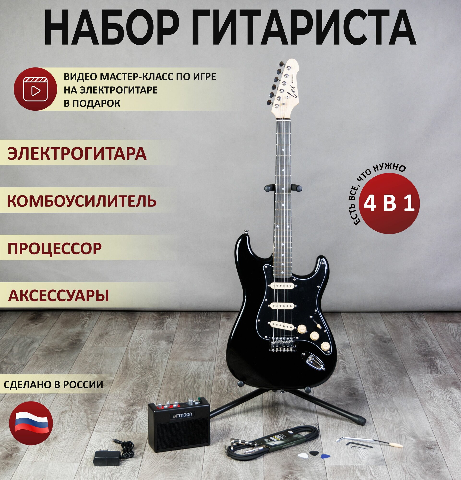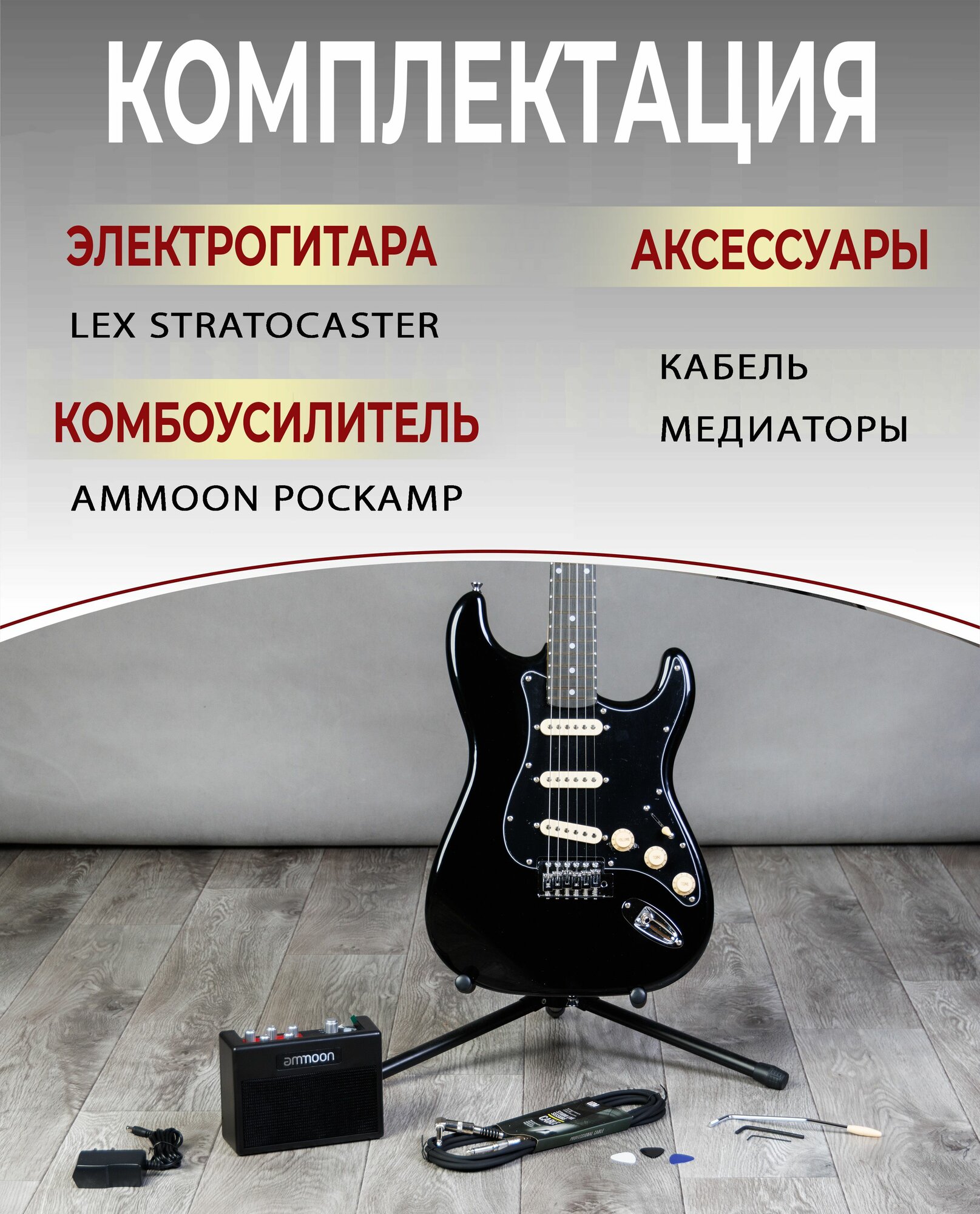 Гитара 4/4 LEX guitar набор гитариста (электрогитара, комбоусилитель, провод, медиаторы) интересное: