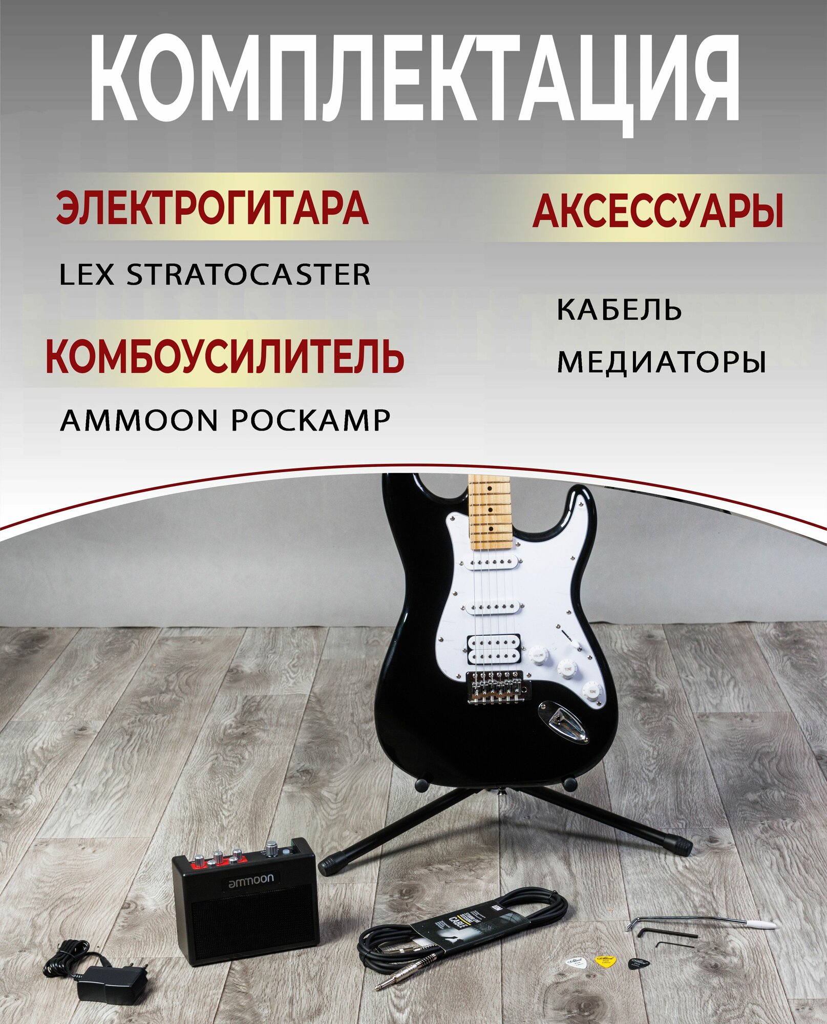 Гитара 4/4 LEX guitar набор гитариста (электрогитара, комбоусилитель, провод, медиаторы)