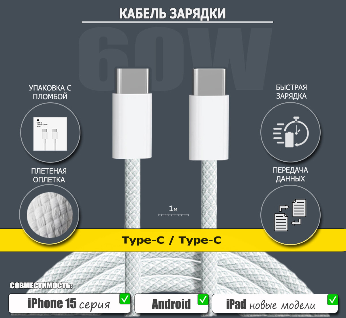 Кабель TypeC-TypeC для iPhone 15 Pro Max, Plus, iPad Pro, Android, 60 Вт интересное: