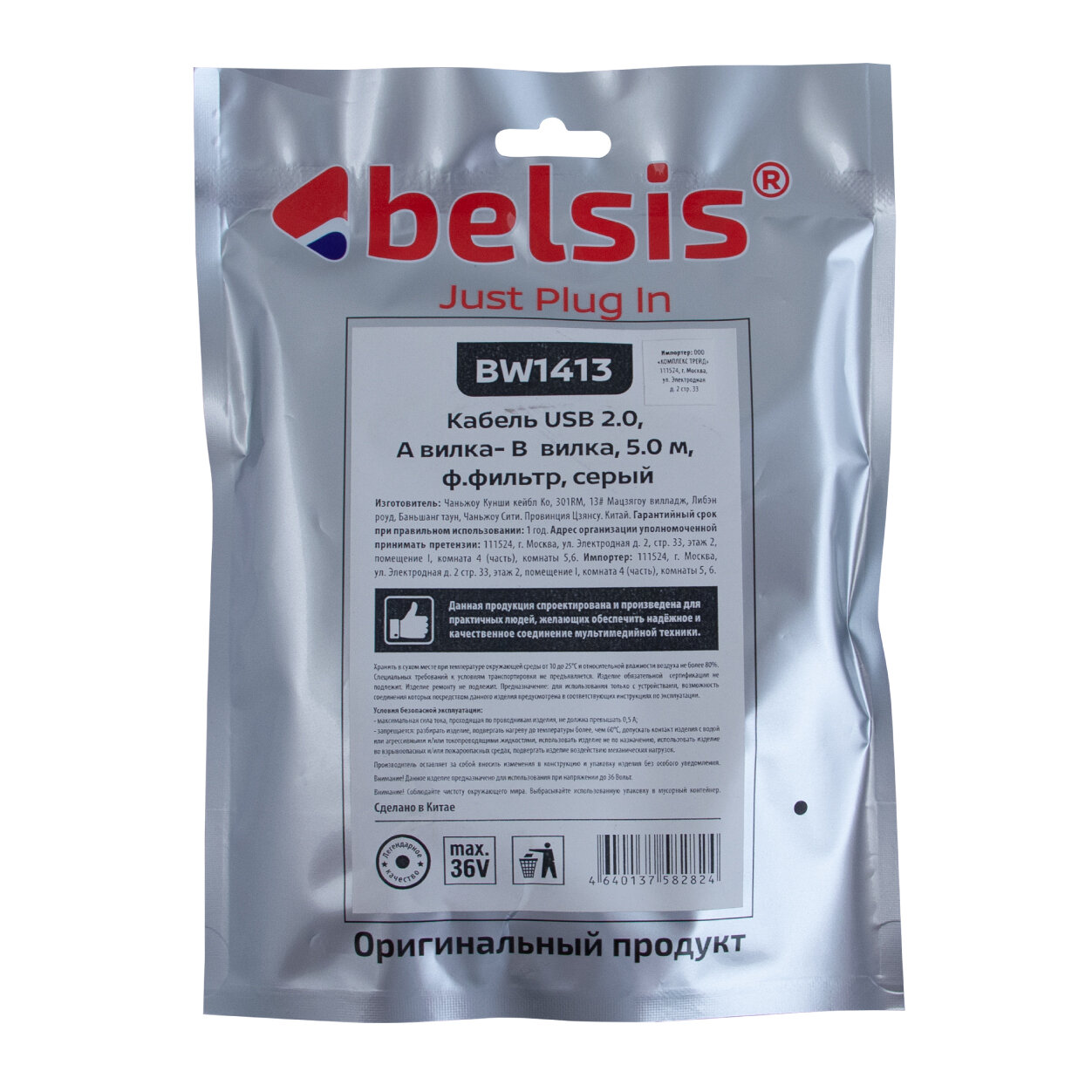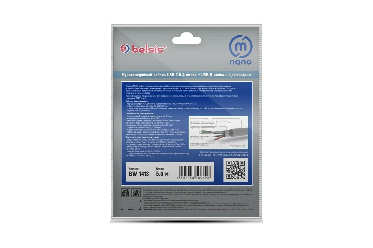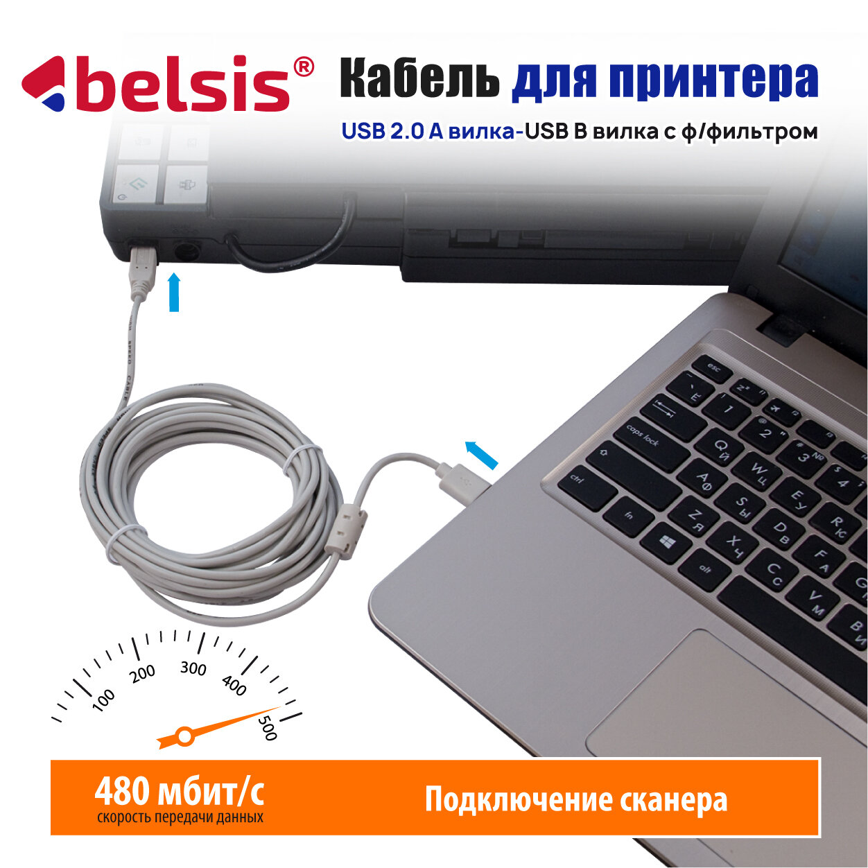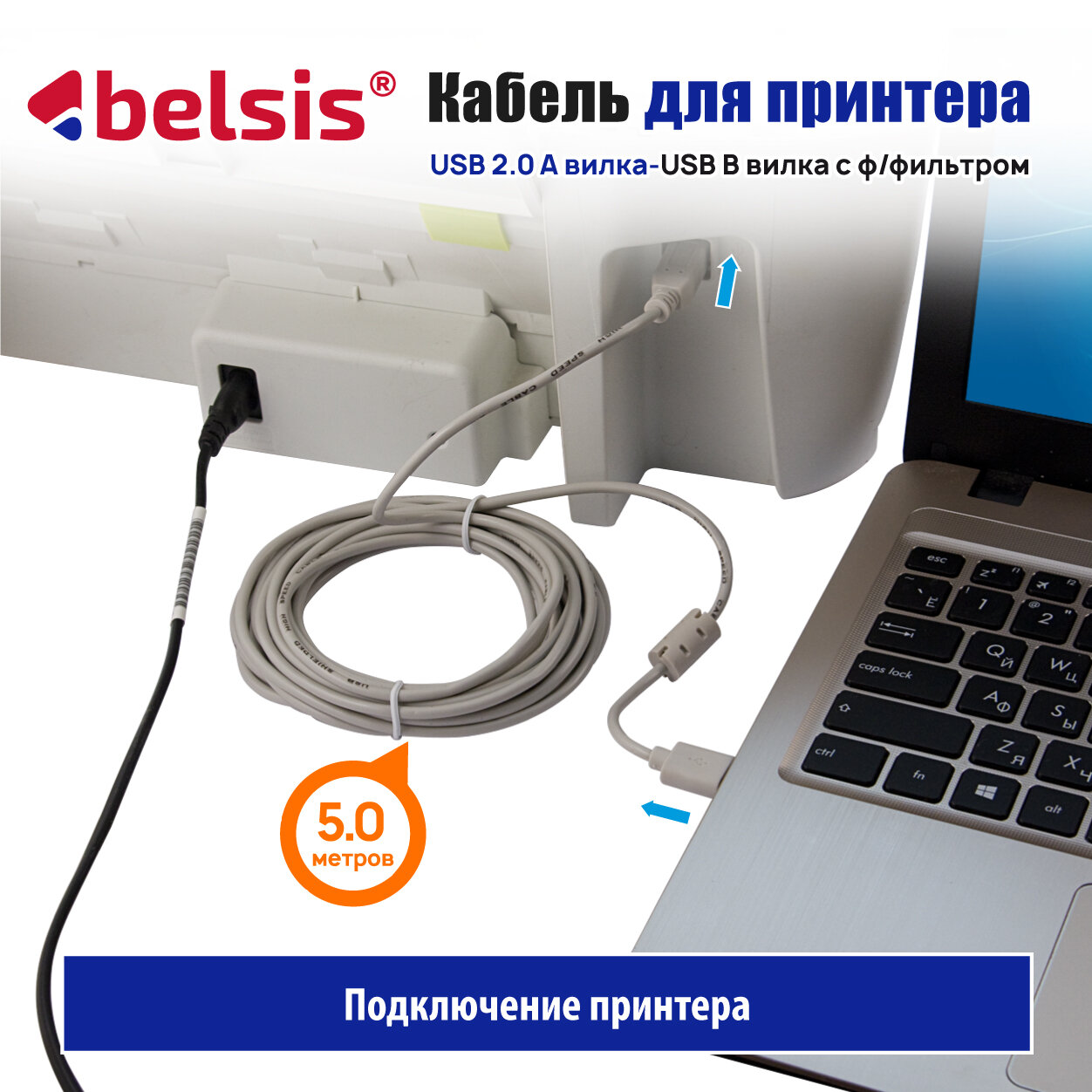 Купить Кабель для принтера USB 2.0 A - B с ферритоовым фильтром,480 Мбт/с , Belsis ,длина 5 метров , для сканера, цифрового пианино, цап и т.д./ BW1413