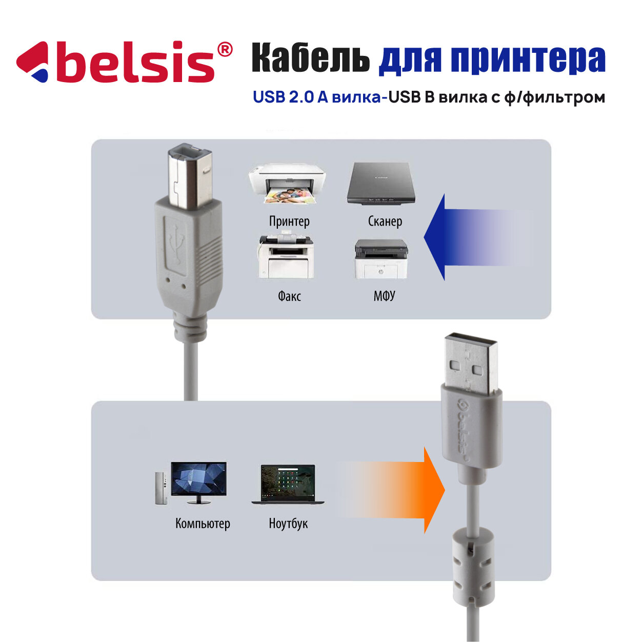 Кабель для принтера USB 2.0 A - B с ферритоовым фильтром,480 Мбт/с , Belsis ,длина 1,8 метра , для сканера, цифрового пианино, цап и т.д./ BW1411