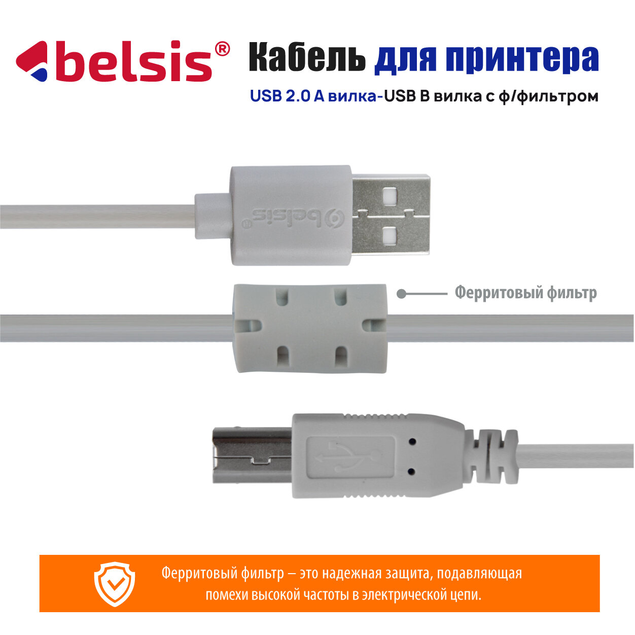 Кабель USB A(M) – USB B(M) Belsis BW1411, ферритовый фильтр, позолоченные контакты, 1.8 метра, v2.0