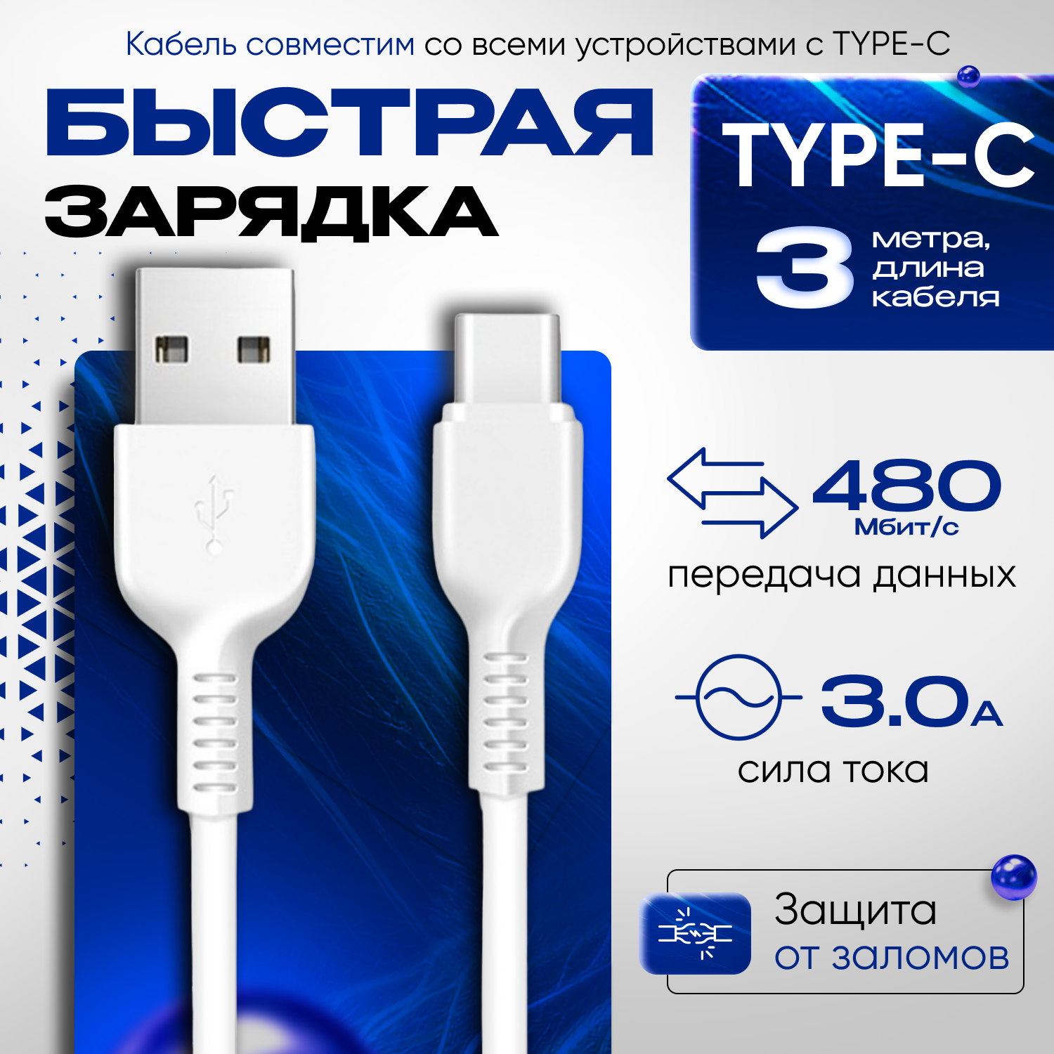 Кабель для зарядки телефона USB Type C 3 метра, быстрая зарядка провод для смартфона Honor, Huawei, Samsung, Xiaomi, белый