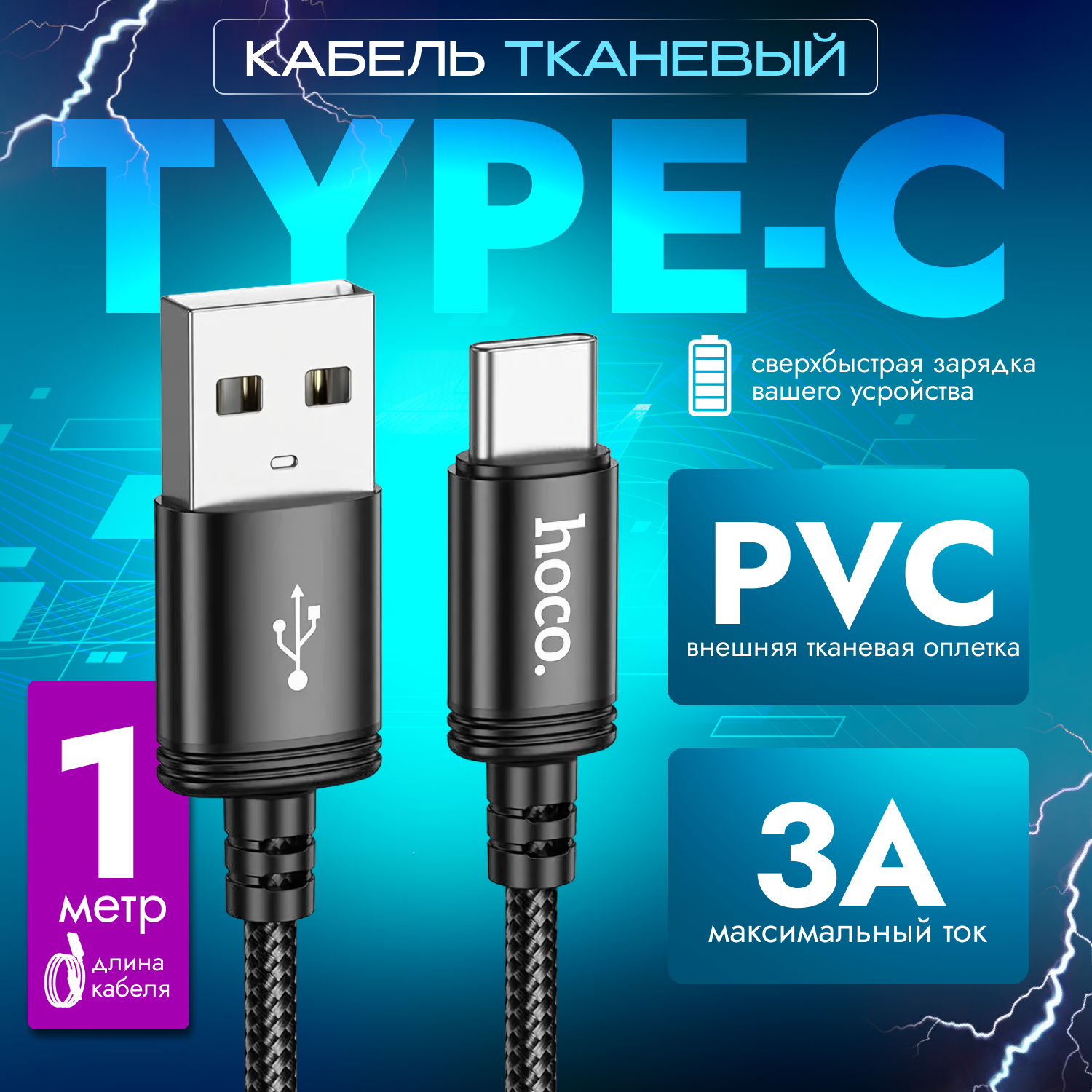 Кабель тканевый USB Type-C 3А для зарядки телефона и передачи данных, быстрая зарядка провод type c, шнур 1 метр, черный интересное:
