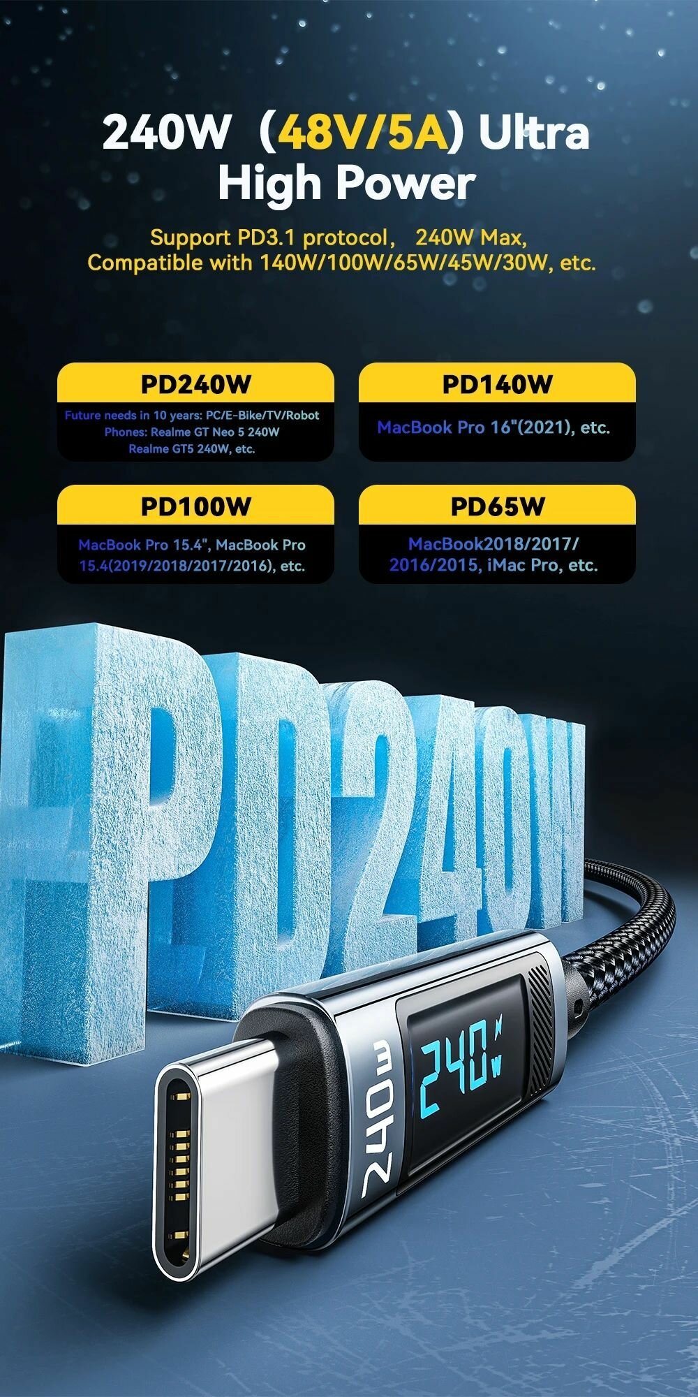 Кабель Essager Type-C-Type-C для быстрой зарядки и передачи данных с измерителем силы тока, 240W, 5A, 480Mbps, 2 м, мощная зарядка для телефонов, ноутбуков планшетов интересное: