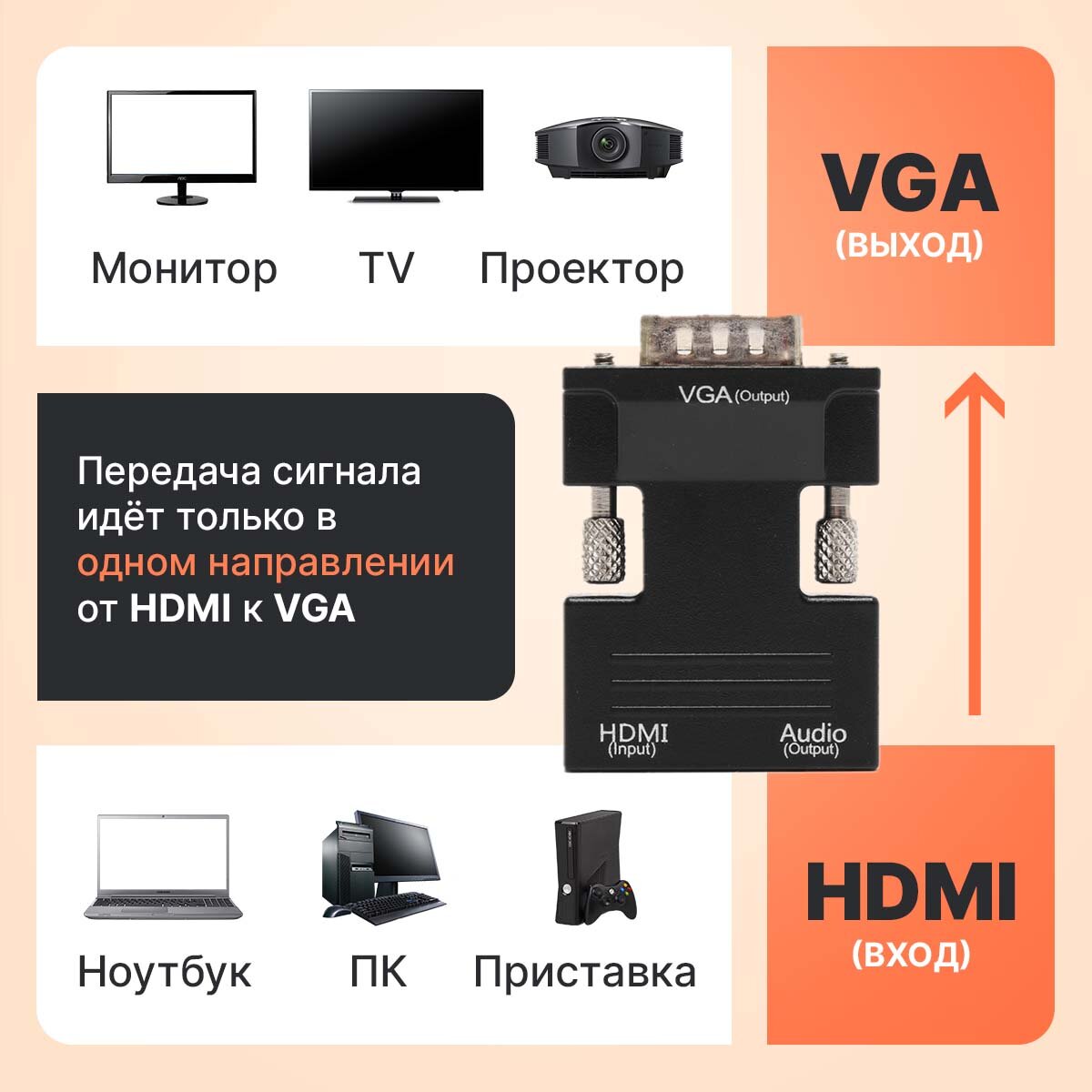 | Дополнительная информация | HDMI, VGA, переходник, коннектор, адаптер, односторонний, вга, передача видеосигнала, подключение старого оборудования |