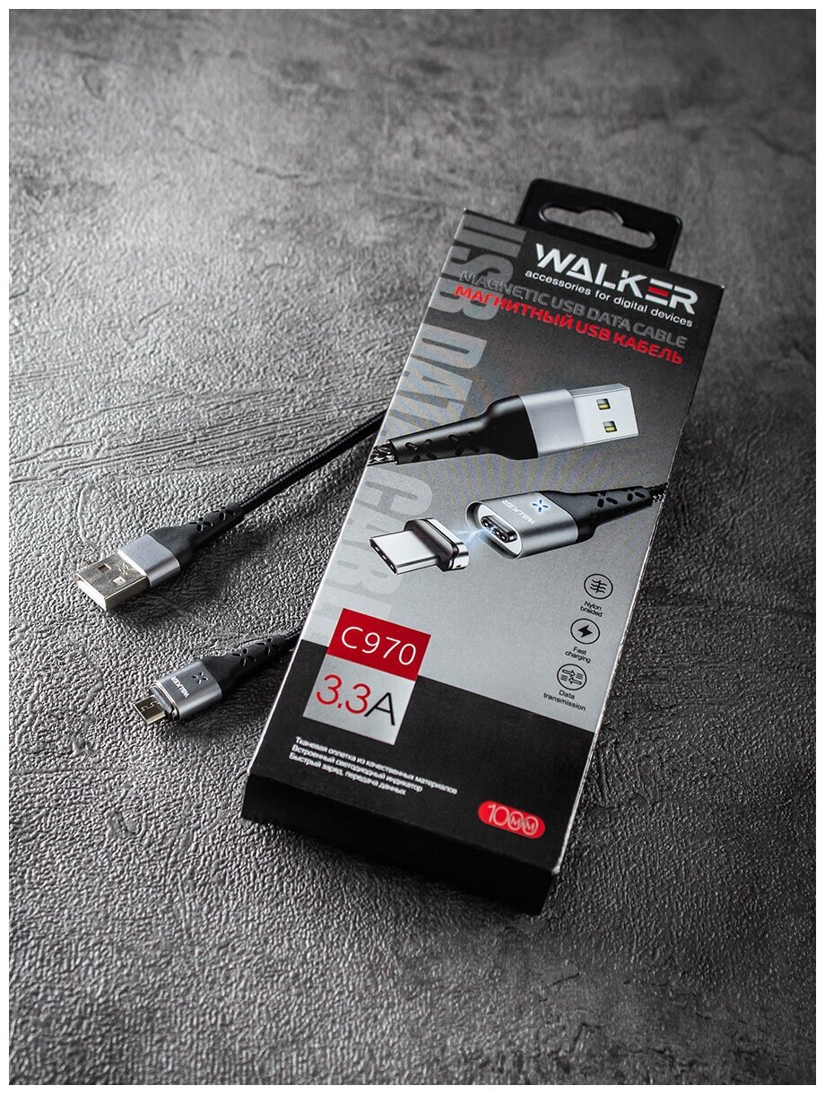 Купить Магнитный кабель с быстрым зарядом 3.3А, передача данных, USB - micro USB, WALKER, C970, зарядное устройство, зарядка микро на телефон android, черный