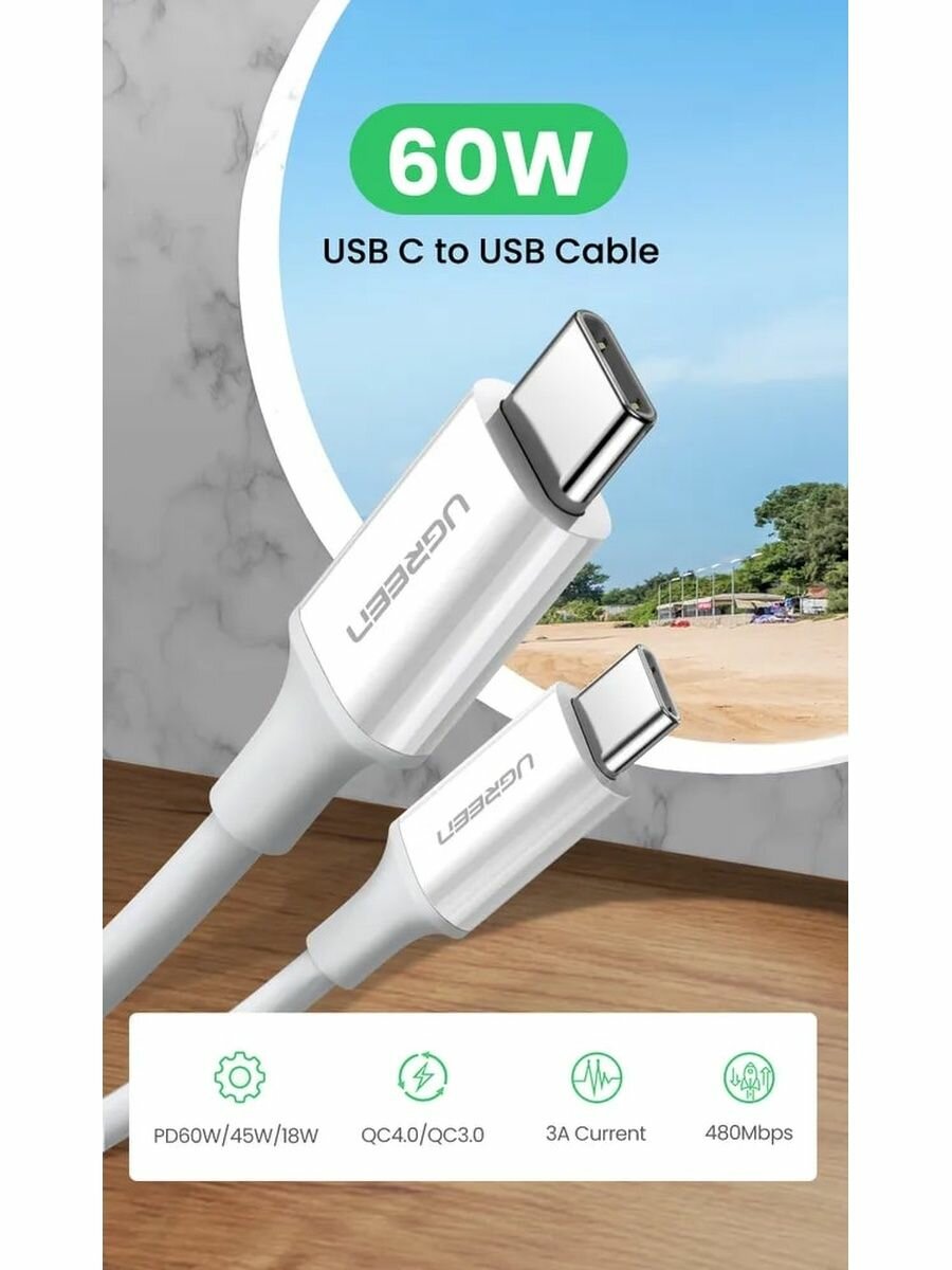 Кабель UGREEN US264 (60519) USB-C 2.0 Male To USB-C 2.0 Male 3A 60W Data Cable (1,5 метра) белый