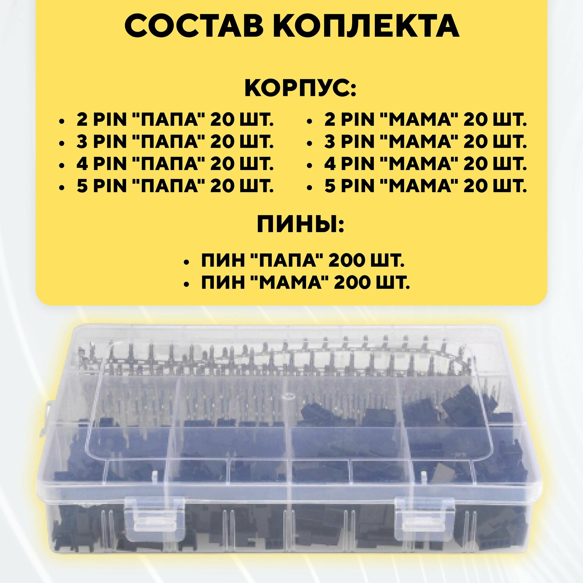 | Дополнительная информация | 2 pin корпус "папа" 5 шт; 3 pin корпус "папа" 5 шт; 4 pin корпус "папа" 5 шт; 5 pin корпус "папа" 5 шт; 2 pin корпус "мама" 5 шт; 3 pin корпус "мама" 5 шт; 4 pin корпус "мама" 5 шт; 5 pin корпус "мама" 5 шт; пин "папа" 80 шт; пин "мама" 80 шт. |