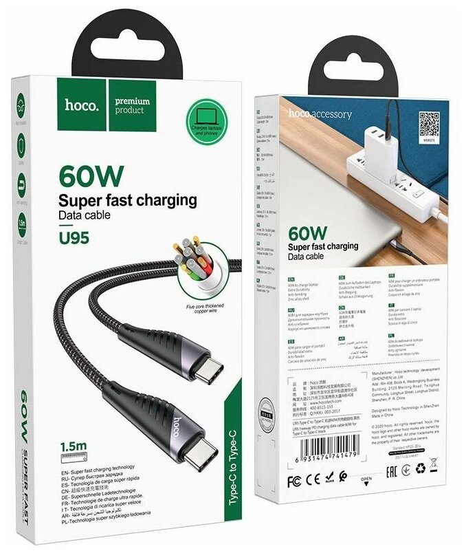 Кабель Type-C на Type-C Hoco “U95 Freeway” PD 60W зарядка и передача данных интересное: