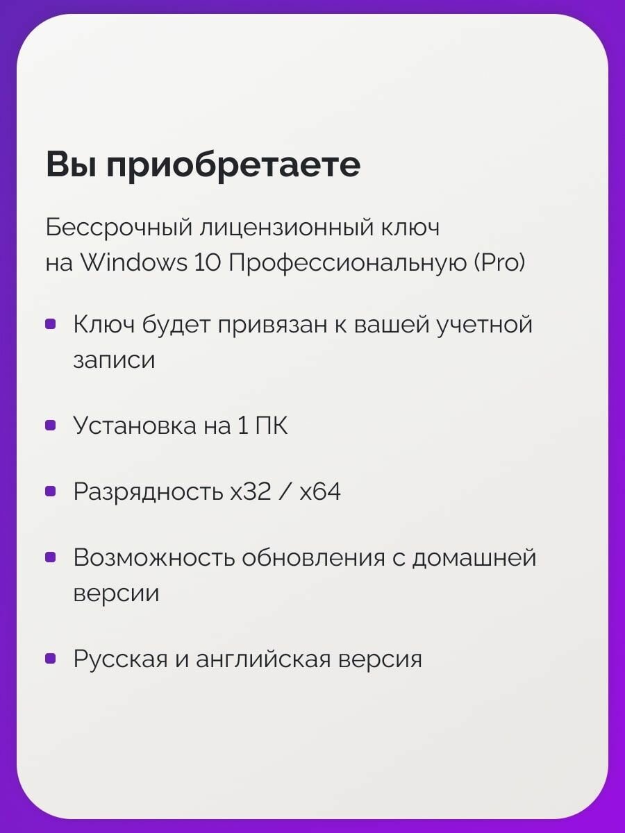 | Состав пакета | Цифровой ключ Windows 10 Pro OEM x32/64 Для любого языка (Бессрочный) |