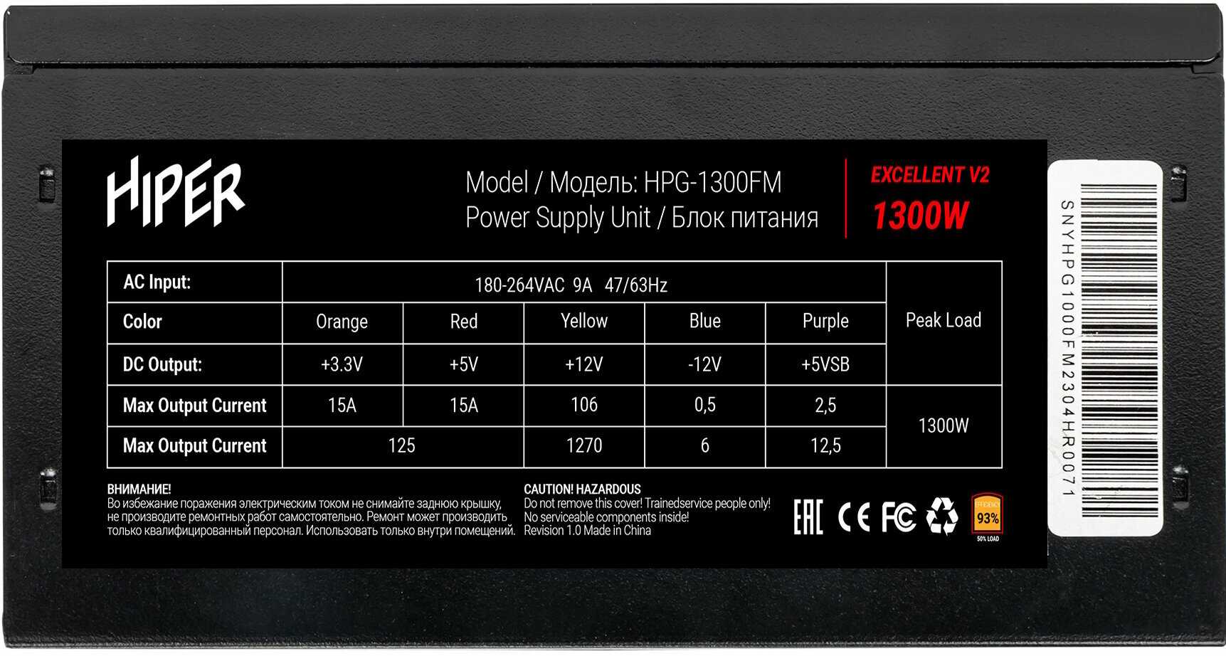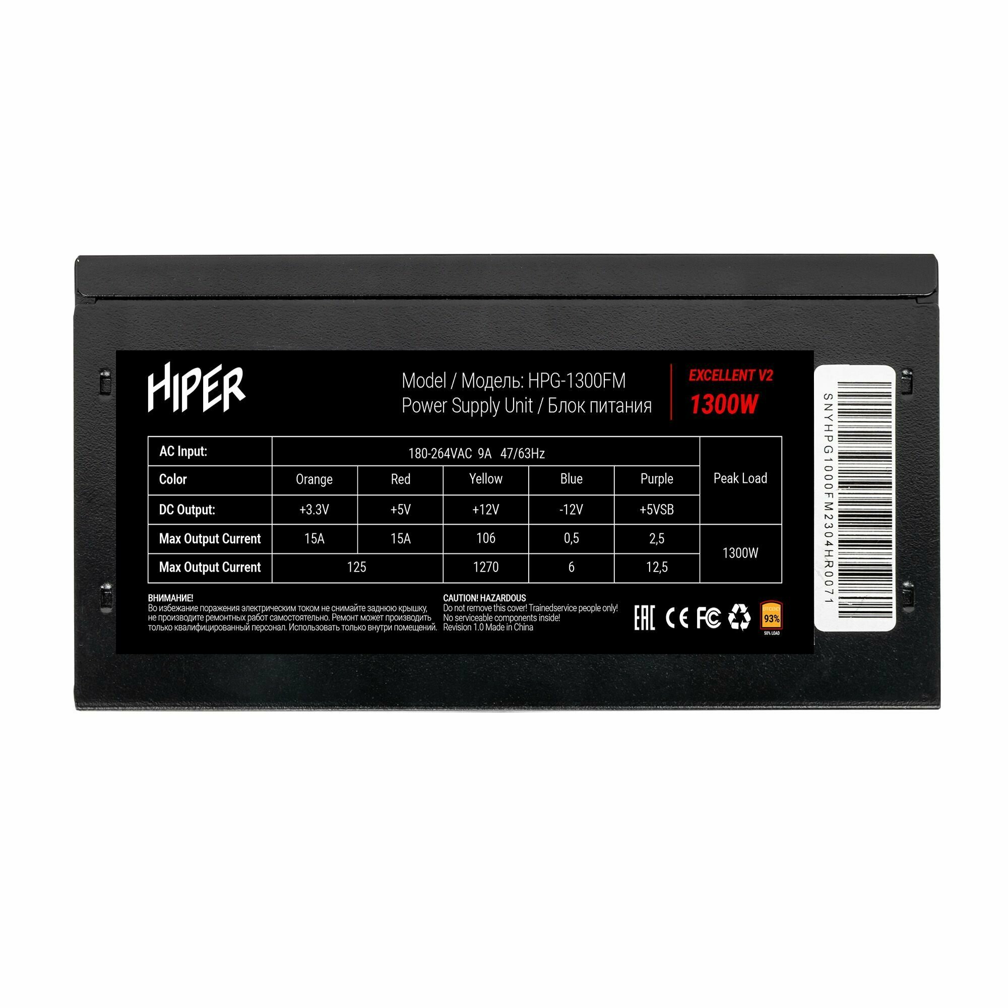 Блок питания для ПК 1300 Ватт PSU Hiper Hpg-1300fm (1300w, Gold 14cm Fan, 220V input, Efficiency 93% .