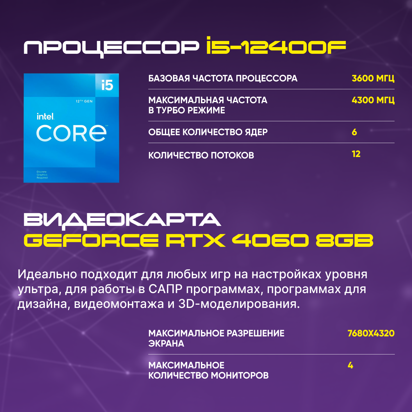 Системный блок игровой AURORA GAMING ПК Игровой компьютер (Intel Core i5-12400F (2.5 ГГц), RAM 16 ГБ, SSD 1000 ГБ, NVIDIA GeForce RTX 4060 (8 ГБ), Windows 11 Pro), черный