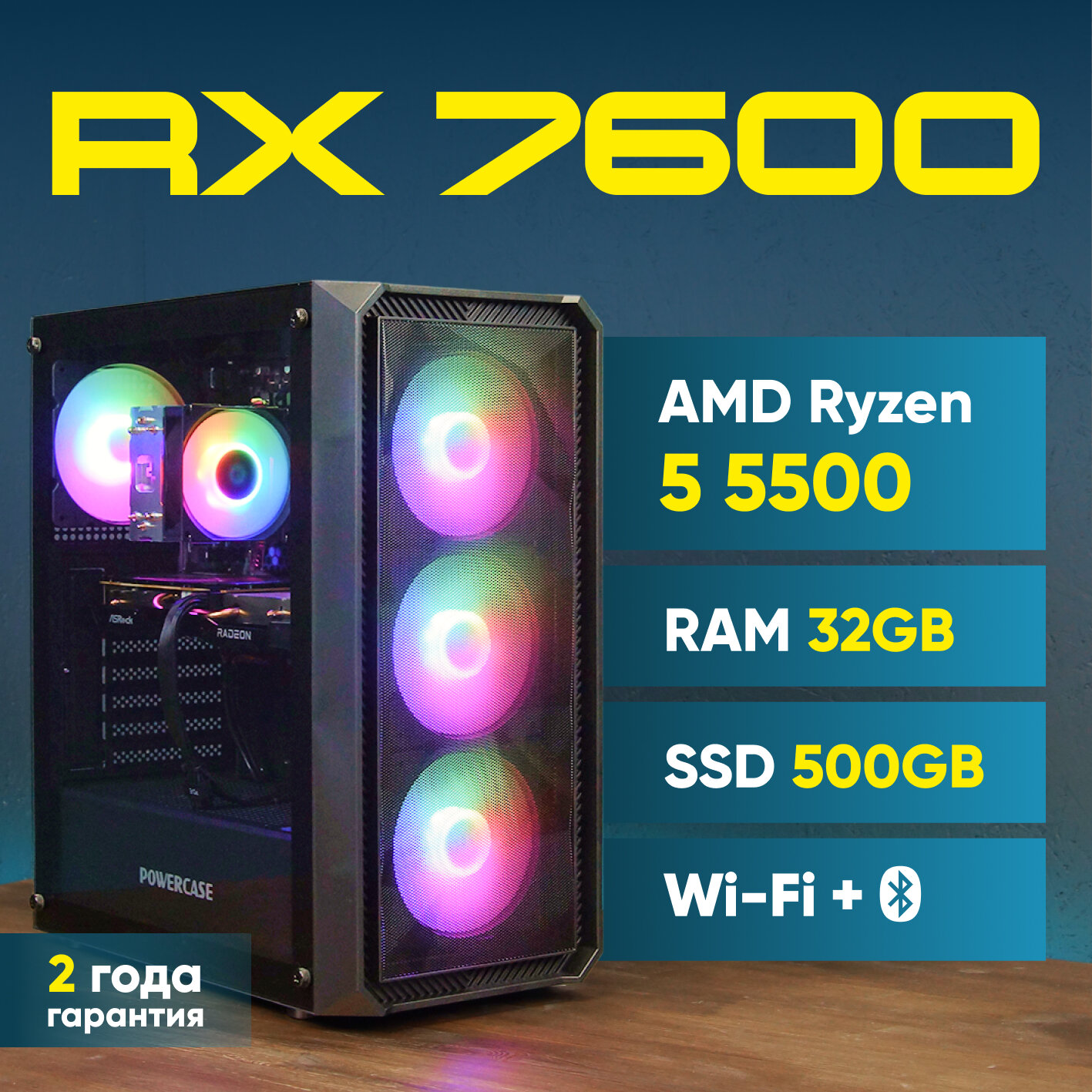 Системный блок игровой AURORA GAMING ПК Игровой компьютер (AMD Ryzen 5 5500 (3.6 ГГц), RAM 32 ГБ, SSD 500 ГБ, AMD Radeon RX 7600 (8 Гб), Windows 11 Pro), черный