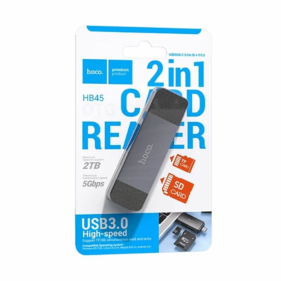Картридер 2 в 1, USB/Type-C 3.0, HB45, HOCO, поддержка TF/SD карт, серый