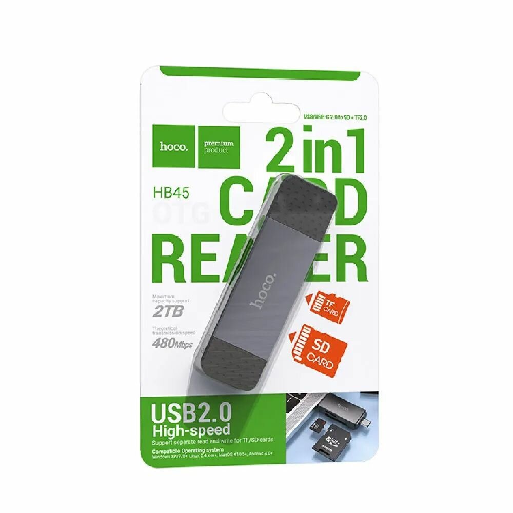 Картридер 2 в 1, USB/Type-C 2.0, HB45, HOCO, поддержка TF/SD карт, серый