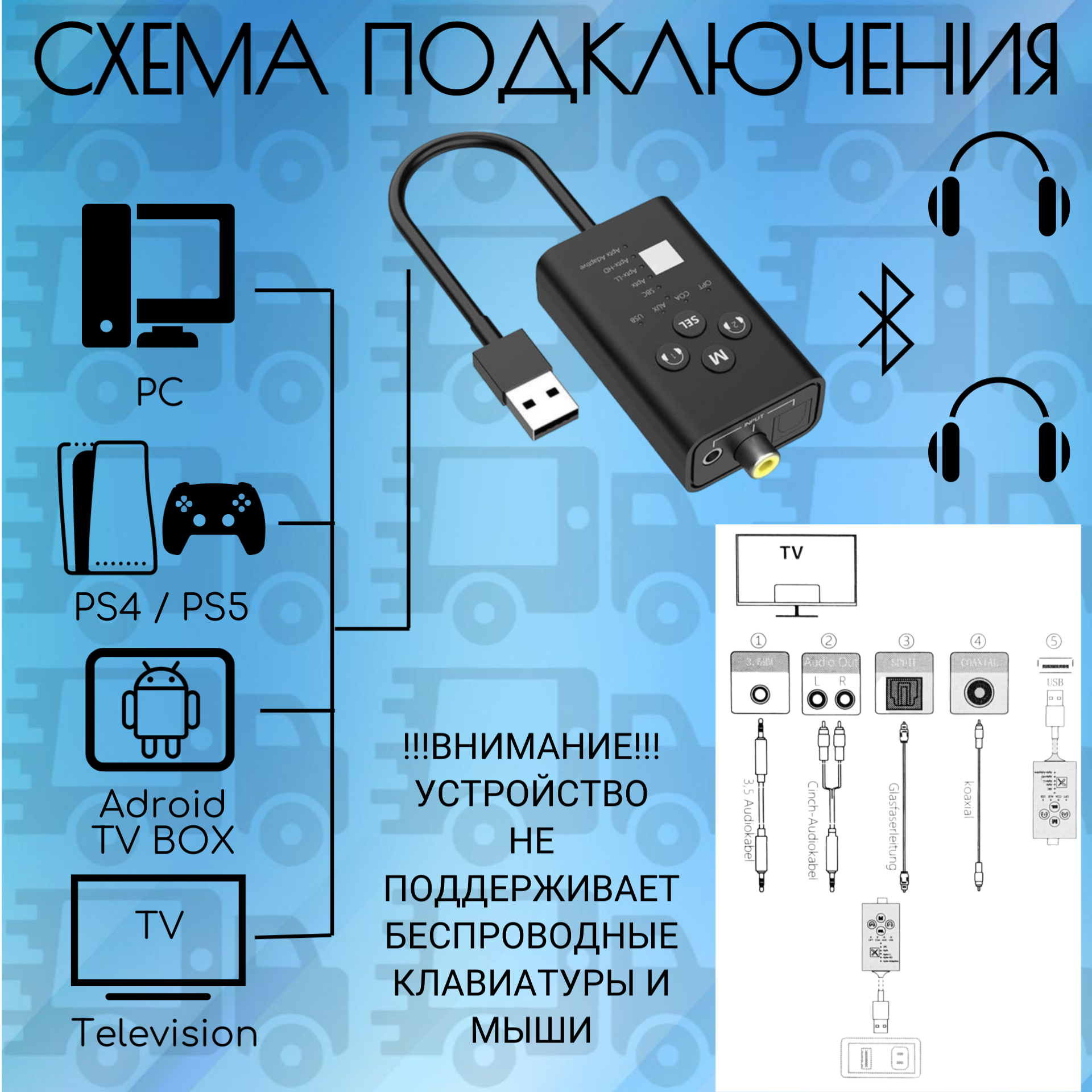 Блютуз передатчик для подключения двух аудио устройств Bluetooth 5.0 5.2 входы USB AUX Optical оптика coxial интересное: