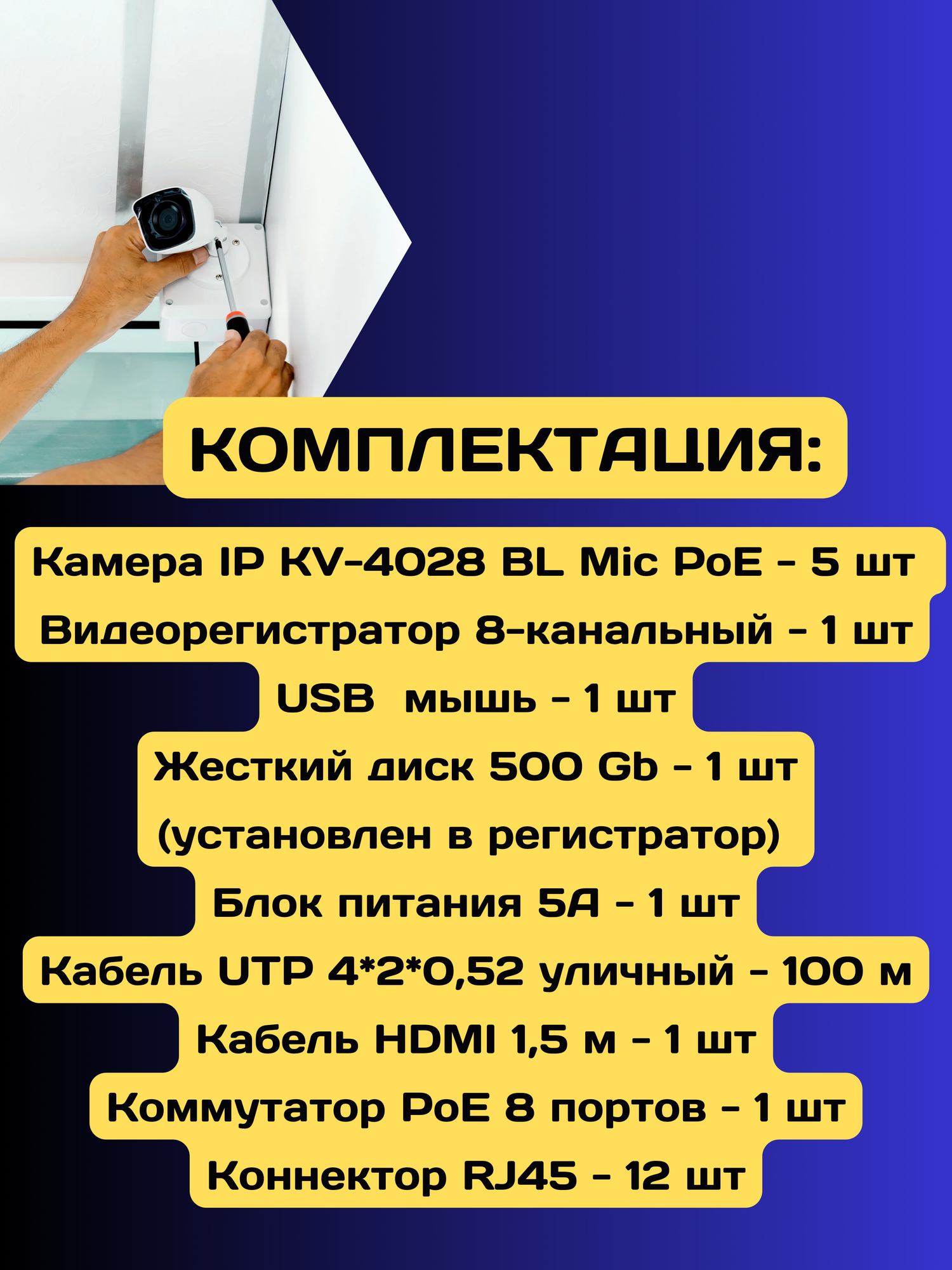 | Подробная комплектация | камера видеонаблюдения - 7 шт; видеорегистратор - 1 шт; оптическая мышь- 1 шт; жесткий диск 500 gb - 1 шт; блок питания - 1 шт; кабель utp - 140 м; кабель HDMI 1,5 м- 1 шт; коммутатор - 1 шт; коннектор - 16 шт; |