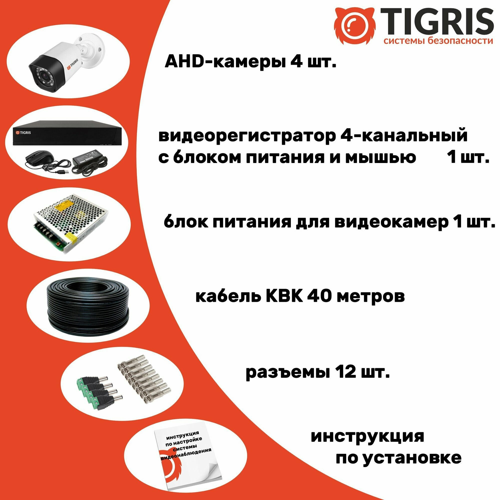 | Подробная комплектация | В комплект входит: 1. Видеорегистратор профессиональный, 4-канальный (блок питания и мышь для управления в комплекте)- 1 шт. 2. Видеокамера уличная 5 мегапикселей- 4 шт. 3. Блок питания для видеокамер- 1 шт. 4. Кабель уличный, комбинированный (питание+видеосигнал)- 40 метров. 5. Комплект разъемов для подключения системы- 1 шт. 6. Инструкция по подключению системы- 1 шт. |